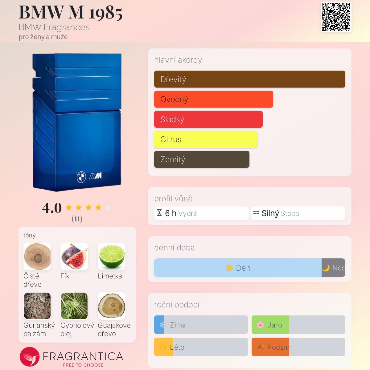 BMW M 1985 podle BMW Fragrances je Woody Aromatic vůně pro ženy a muže. Toto je nová vůně. BMW M 1985 byl/a uveden/a v roce 2025. BMW M 1985 byl/a vytvořen/a Alexandra Monet a Frank Voelkl. Vrchní tóny jsou Fík, Limetka a Elimi; střední tóny jsouČisté dřevo, Gurjanský balzám a Cypřiš ; základní tóny jsou Cypriolový olej, Guajakové dřevo a Cedr.