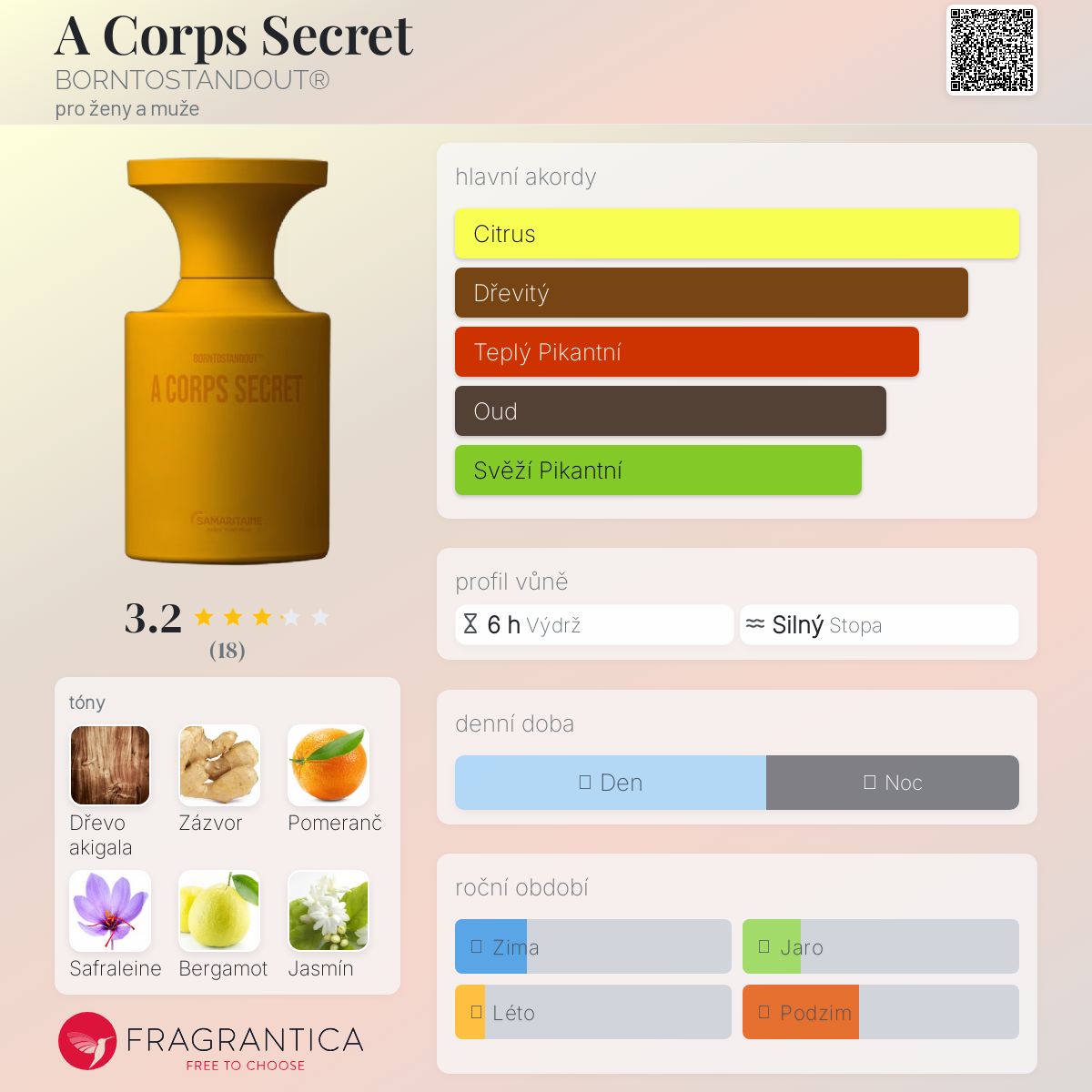 A Corps Secret podle BORNTOSTANDOUT® je Orientální Woody vůně pro ženy a muže. Toto je nová vůně. A Corps Secret byl/a uveden/a v roce 2025. "Nosem" za touto vůní je Jordi Fernández. Vrchní tóny jsou Zázvor, Safraleine, Bergamot, Mandarinka, Kůra a Skořice; střední tóny jsouDřevo akigala, Pomeranč, Jasmín Sambac, Mahonial, Pralinka a Peruánský balzám ; základní tóny jsou Labdanum, Agarové dřevo (oud), Cypriolový olej, Pačuli a Vanilka.