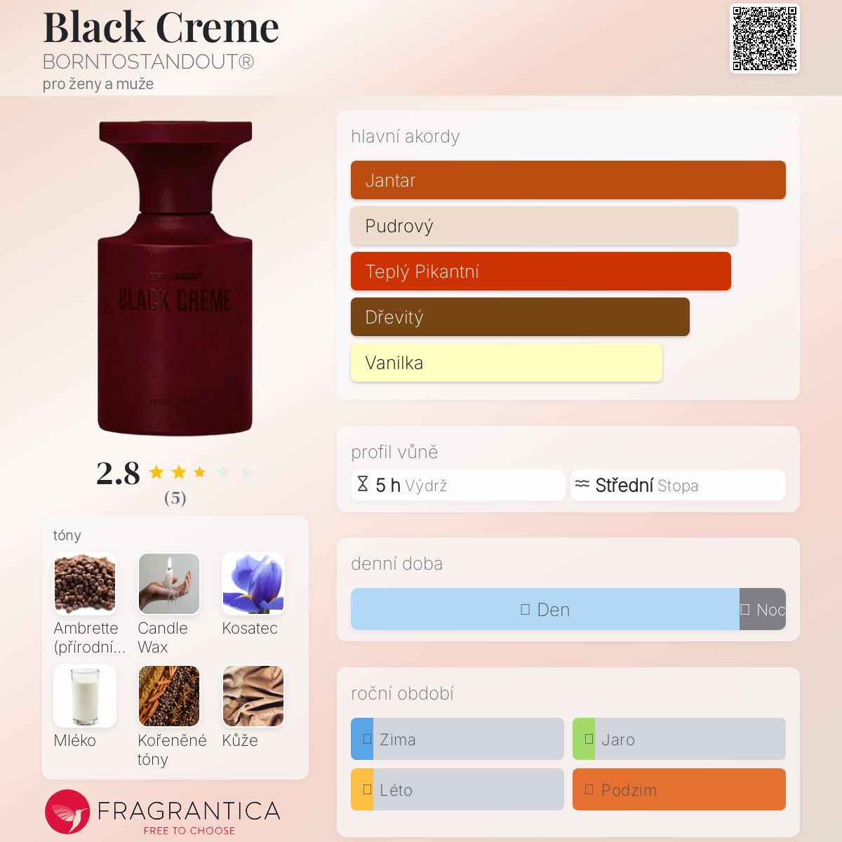 Black Creme podle BORNTOSTANDOUT® je Orientální Vanilla vůně pro ženy a muže. Toto je nová vůně. Black Creme byl/a uveden/a v roce 2025. "Nosem" za touto vůní je Quentin Bisch. Vrchní tóny jsou Ambrette (přírodní pižmo), Svíčkový vosk, Kosatec, Mléko a Koření; střední tóny jsouKůže, Myrha, Agarové dřevo (oud) a Vanilka ; základní tóny jsou Jantar (ambra), Karamel, Georgywood a Santalové dřevo.