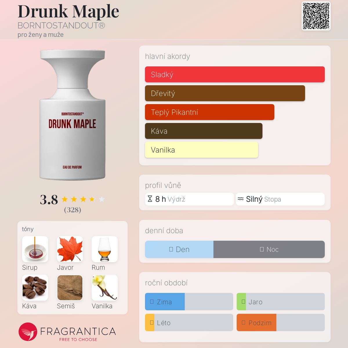 Drunk Maple podle BORNTOSTANDOUT® je Orientální Vanilla vůně pro ženy a muže. Toto je nová vůně. Drunk Maple byl/a uveden/a v roce 2024. "Nosem" za touto vůní je Alex Lee. Vrchní tóny jsou Rum, Davana a Růžový pepř; střední tóny jsouSirup, Javor, Káva a Semiš ; základní tóny jsou Vanilka, Benzoin, Orcanox™ a Santalové dřevo.