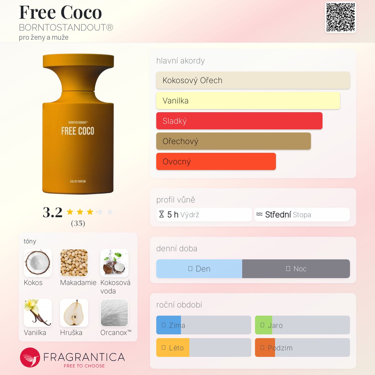 Free Coco podle BORNTOSTANDOUT® je Orientální Vanilla vůně pro ženy a muže. Toto je nová vůně. Free Coco byl/a uveden/a v roce 2025. "Nosem" za touto vůní je Jérôme di Marino. Vrchní tóny jsou Kokosová voda a Hruška; střední tóny jsouKokos a Makadamie ; základní tóny jsou Vanilka, Bourbonská vanilka, Vanilka a Orcanox™.
