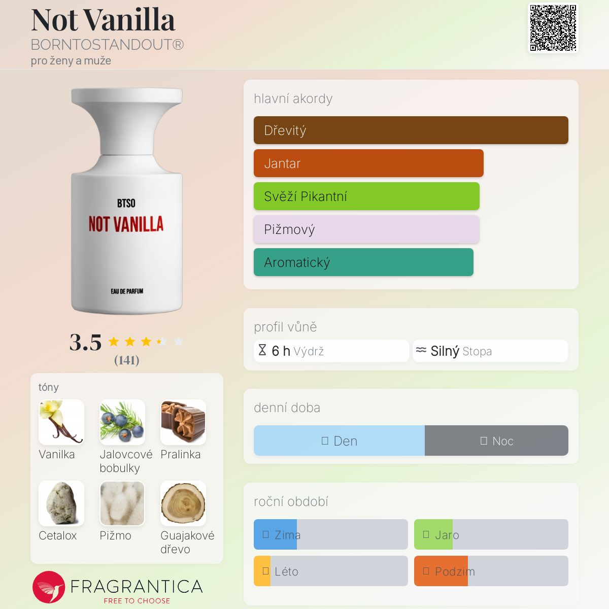 Not Vanilla podle BORNTOSTANDOUT® je Orientální Woody vůně pro ženy a muže. Not Vanilla byl/a uveden/a v roce 2022. Not Vanilla byl/a vytvořen/a Frank Voelkl a Florian Gallo. Vrchní tóny jsou Kafr, Muškátový oříšek a Bergamot; střední tóny jsouVanilka, Jalovcové bobulky, Cedr a Fialka ; základní tóny jsou Pralinka, Cetalox, Pižmo, Guajakové dřevo, Jantar (ambra) a Mech.