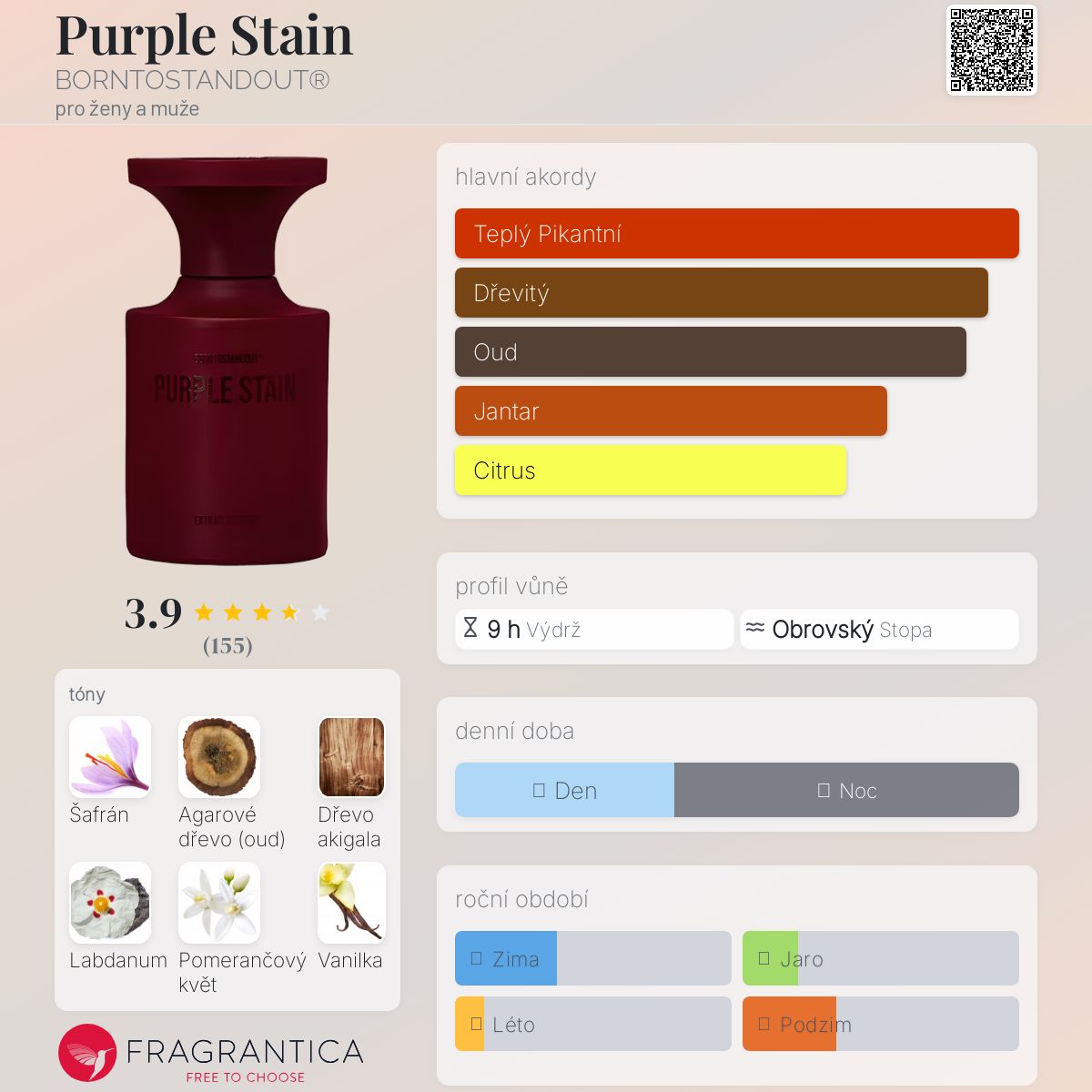 Purple Stain podle BORNTOSTANDOUT® je Orientální Spicy vůně pro ženy a muže. Toto je nová vůně. Purple Stain byl/a uveden/a v roce 2025. "Nosem" za touto vůní je Jordi Fernández. Vrchní tóny jsou Šafrán, Skořice, Mandarinka, Bergamot, Zázvor, Muškátový oříšek a Kůra; střední tóny jsouPomerančový květ, Vanilka, Peruánský balzám a Karamel ; základní tóny jsou Agarové dřevo (oud), Dřevo akigala, Labdanum, Pačuli, Cypriolový olej, Ambrofix™ a Beton.