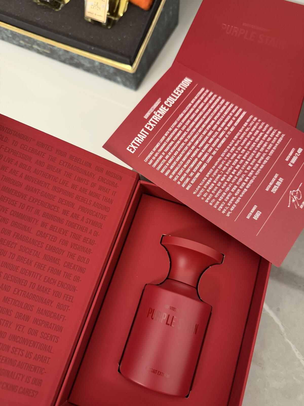 Purple Stain podle BORNTOSTANDOUT® je Orientální Spicy vůně pro ženy a muže. Toto je nová vůně. Purple Stain byl/a uveden/a v roce 2025. "Nosem" za touto vůní je Jordi Fernández. Vrchní tóny jsou Šafrán, Skořice, Mandarinka, Bergamot, Muškátový oříšek, Zázvor a Kůra; střední tóny jsouPomerančový květ, Peruánský balzám, Vanilka a Karamel ; základní tóny jsou Agarové dřevo (oud), Dřevo akigala, Labdanum, Pačuli, Cypriolový olej, Ambrofix™ a Beton.