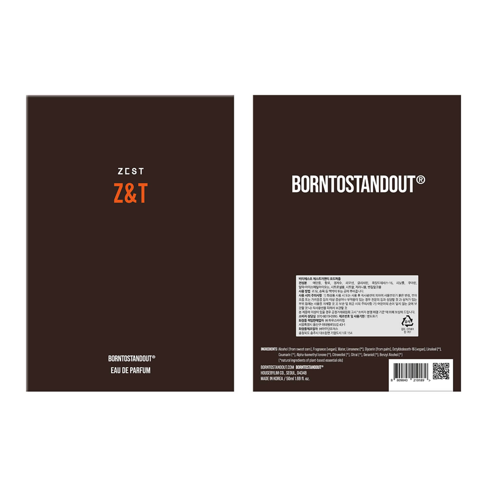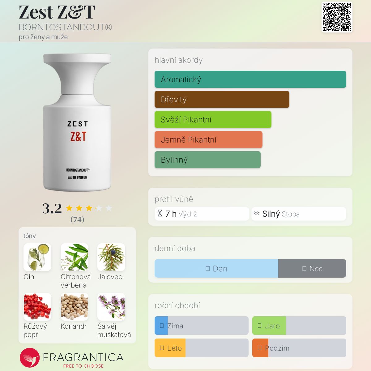Zest Z&T podle BORNTOSTANDOUT® je vůně pro ženy a muže. Toto je nová vůně. Zest Z&T byl/a uveden/a v roce 2022. "Nosem" za touto vůní je Honorine Blanc. Vrchní tóny jsou Gin, Citronová verbena, Jalovec, Růžový pepř a Guatemalský kardamom; střední tóny jsouKoriandr, Šalvěj muškátová a Černý pepř ; základní tóny jsou Pačuli, Elimi a Virginský cedr.