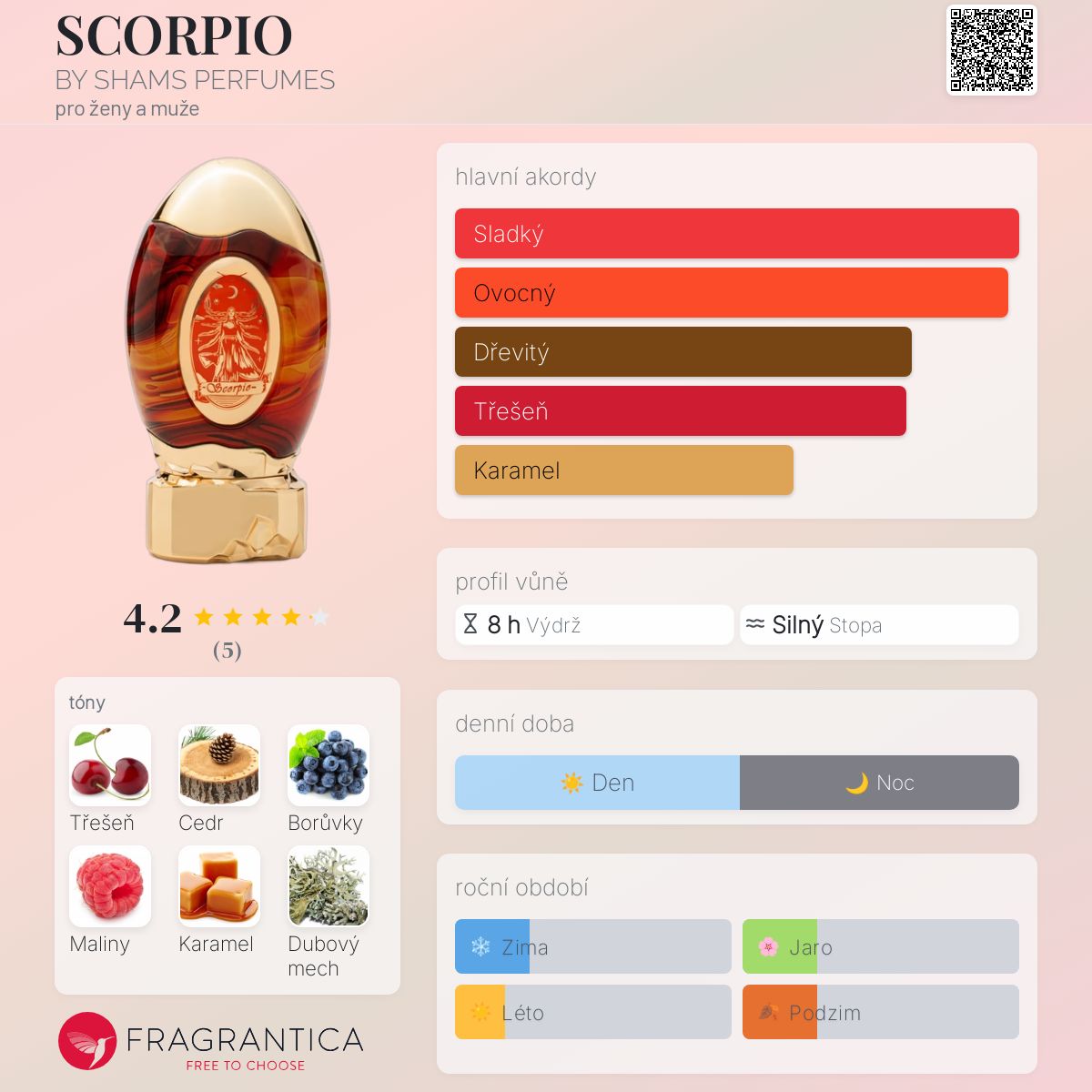 SCORPIO podle BY SHAMS PERFUMES je Floral Fruity Gourmand vůně pro ženy a muže. Toto je nová vůně. SCORPIO byl/a uveden/a v roce 2024. "Nosem" za touto vůní je Leslie Gauthier. Vrchní tóny jsou Třešeň, Borůvky a Pomeranč; střední tóny jsouMaliny a Karamel ; základní tóny jsou Cedr, Mech a Jantar (ambra).
