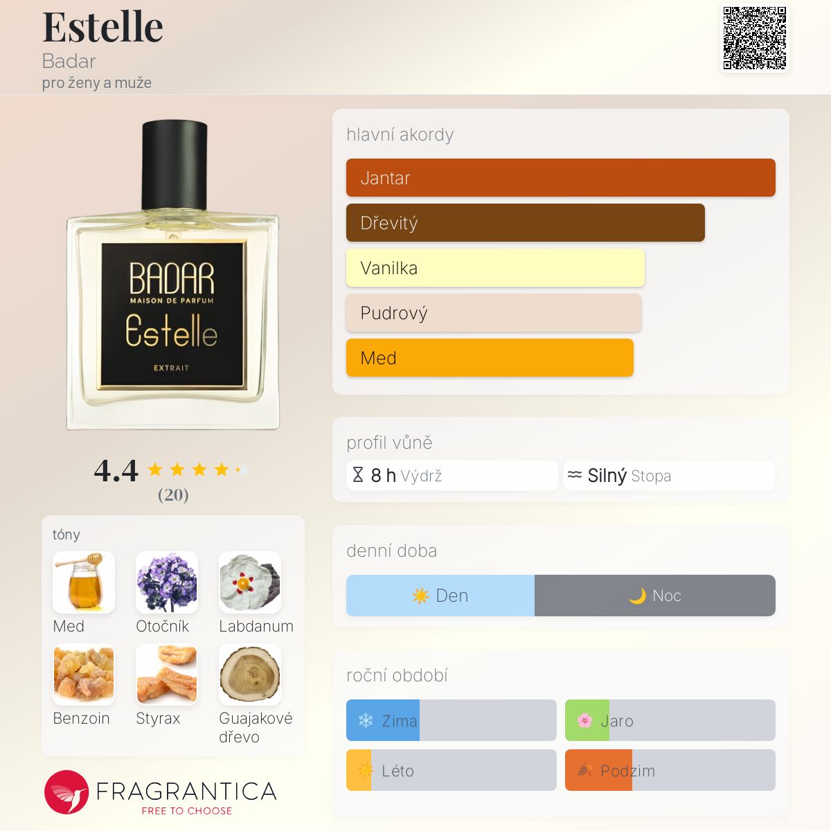 Estelle podle Badar je Orientální Woody vůně pro ženy a muže. Toto je nová vůně. Estelle byl/a uveden/a v roce 2024. "Nosem" za touto vůní je Margaux Le Paih Guérin. Vrchní tón je Otočník ; střední tóny jsouMed, Labdanum, Benzoin, Styrax a Švestka ; základní tóny jsou Guajakové dřevo, Dřevité tóny, Ambroxan, Cypriolový olej, Bílé pižmo, Karamel a Vanilka.