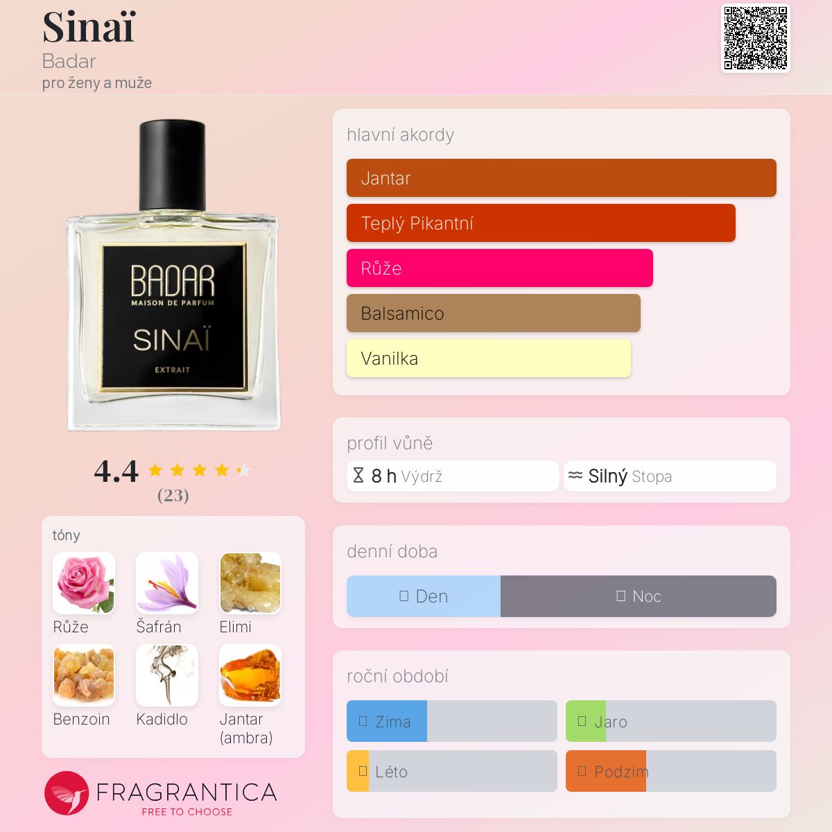 Sinaï podle Badar je Orientální Woody vůně pro ženy a muže. Toto je nová vůně. Sinaï byl/a uveden/a v roce 2024. "Nosem" za touto vůní je Amelie Bourgeois. Vrchní tóny jsou Elimi a Růžový pepř; střední tóny jsouRůže, Šafrán a Slaměnka ; základní tóny jsou Benzoin, Kadidlo, Jantar (ambra), Vanilka, Pižmo a Agarové dřevo (oud).