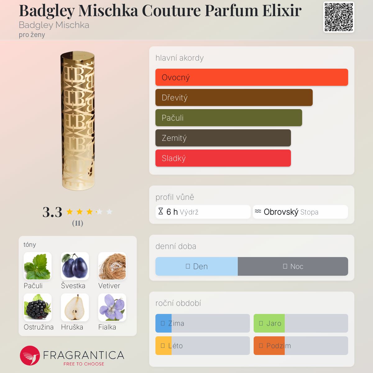 Badgley Mischka Couture Parfum Elixir podle Badgley Mischka je Chypre Fruity vůně pro ženy. Badgley Mischka Couture Parfum Elixir byl/a uveden/a v roce 2008. "Nosem" za touto vůní je Caroline Sabas. Vrchní tóny jsou Švestka, Ostružina a Hruška; střední tóny jsouFialka, Jasmín a Gardénie ; základní tóny jsou Pačuli, Vetiver a Pižmo.