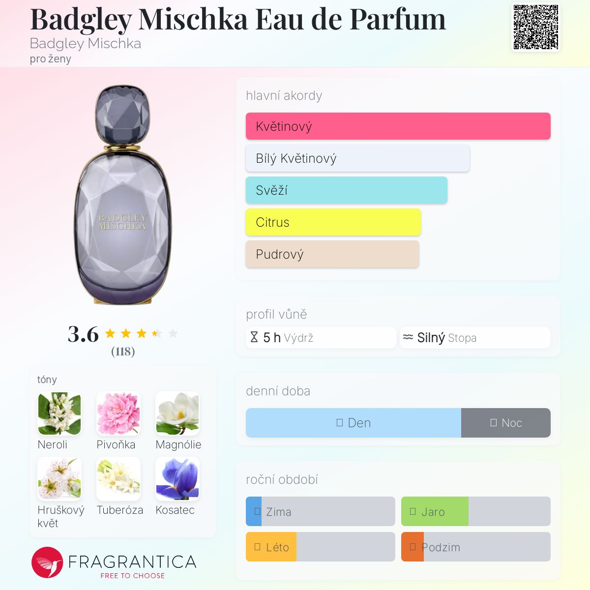 Badgley Mischka Eau de Parfum podle Badgley Mischka je Floral vůně pro ženy. Badgley Mischka Eau de Parfum byl/a uveden/a v roce 2018. "Nosem" za touto vůní je Richard Herpin. Vrchní tóny jsou Neroli, Hruškový květ, Kosatec a Růžový pepř; střední tóny jsouPivoňka, Magnólie, Tuberóza, Jasmín, Jasmín Sambac a Vonokvětka ; základní tóny jsou Pižmo, Santalové dřevo, Jantar (ambra) a Kokos.