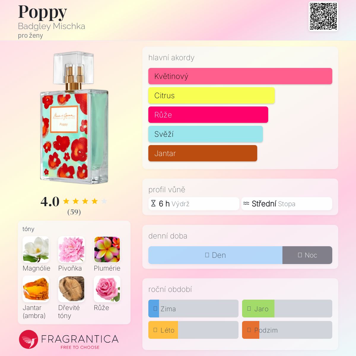 Poppy podle Badgley Mischka je Orientální Floral vůně pro ženy. Poppy byl/a uveden/a v roce 2022. Vrchní tóny jsou Růže, Citrusy a Koření; střední tóny jsouMagnólie, Pivoňka a Plumérie ; základní tóny jsou Jantar (ambra), Bílé dřevo a Pižmo.
