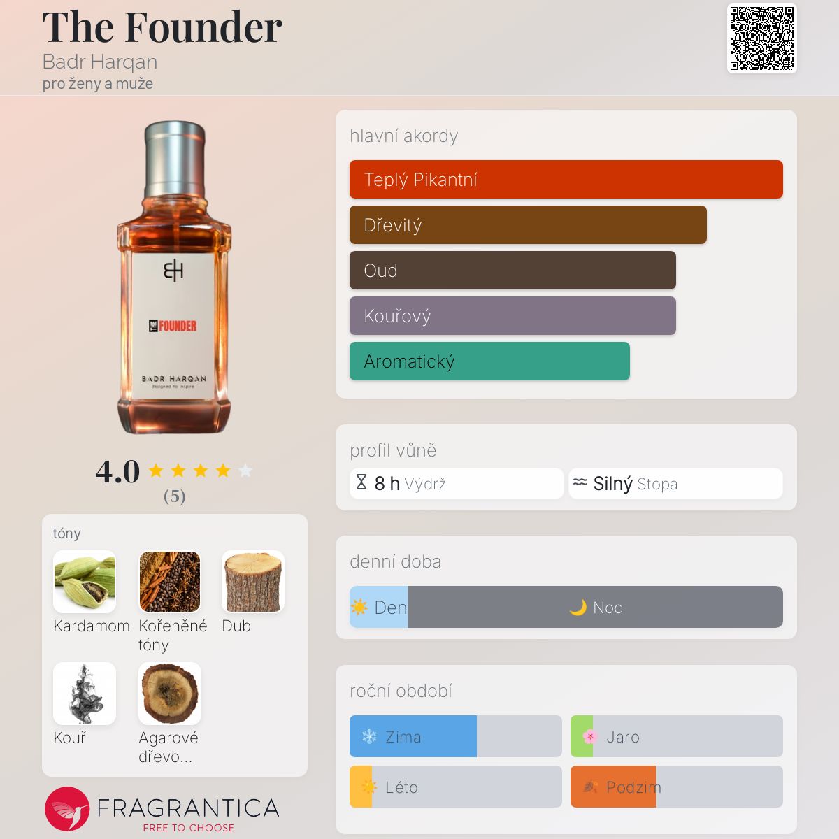 The Founder podle Badr Harqan je Orientální Woody vůně pro ženy a muže. Vrchní tóny jsou Kardamom a Koření; střední tón jeDub ; základní tóny jsou Kouř a Agarové dřevo (oud).