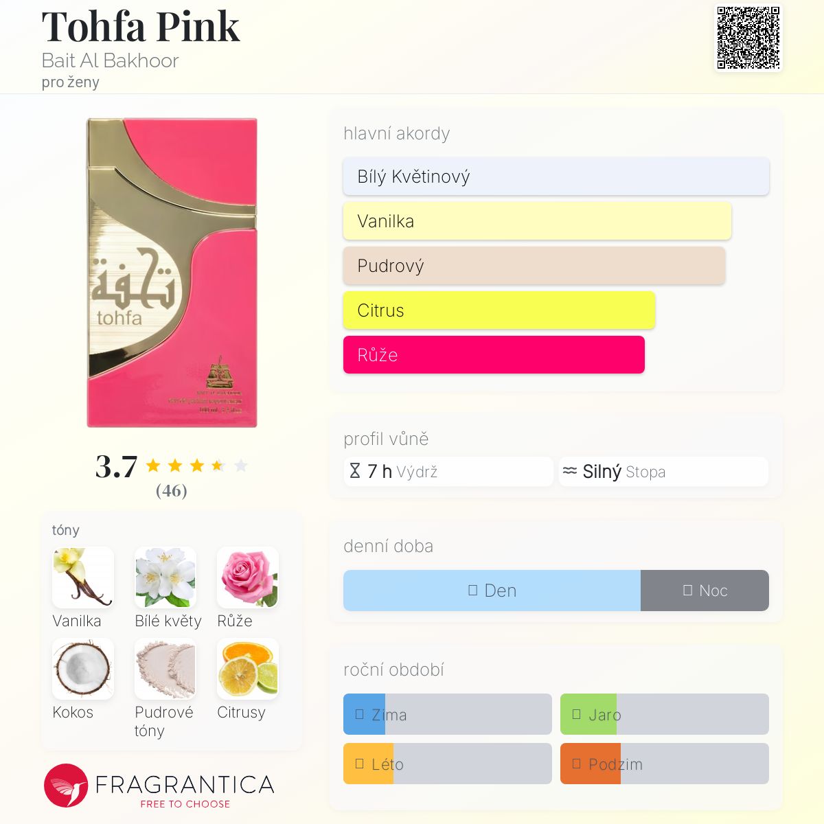 Tohfa Pink podle Bait Al Bakhoor je Floral vůně pro ženy. Tohfa Pink byl/a uveden/a v roce 2021. Vrchní tóny jsou Vanilka, Bílé květy a Růže; střední tóny jsouPudrové tóny, Citrusy a Žluté květy ; základní tóny jsou Kokos, Bílé pižmo a Pomerančový květ.