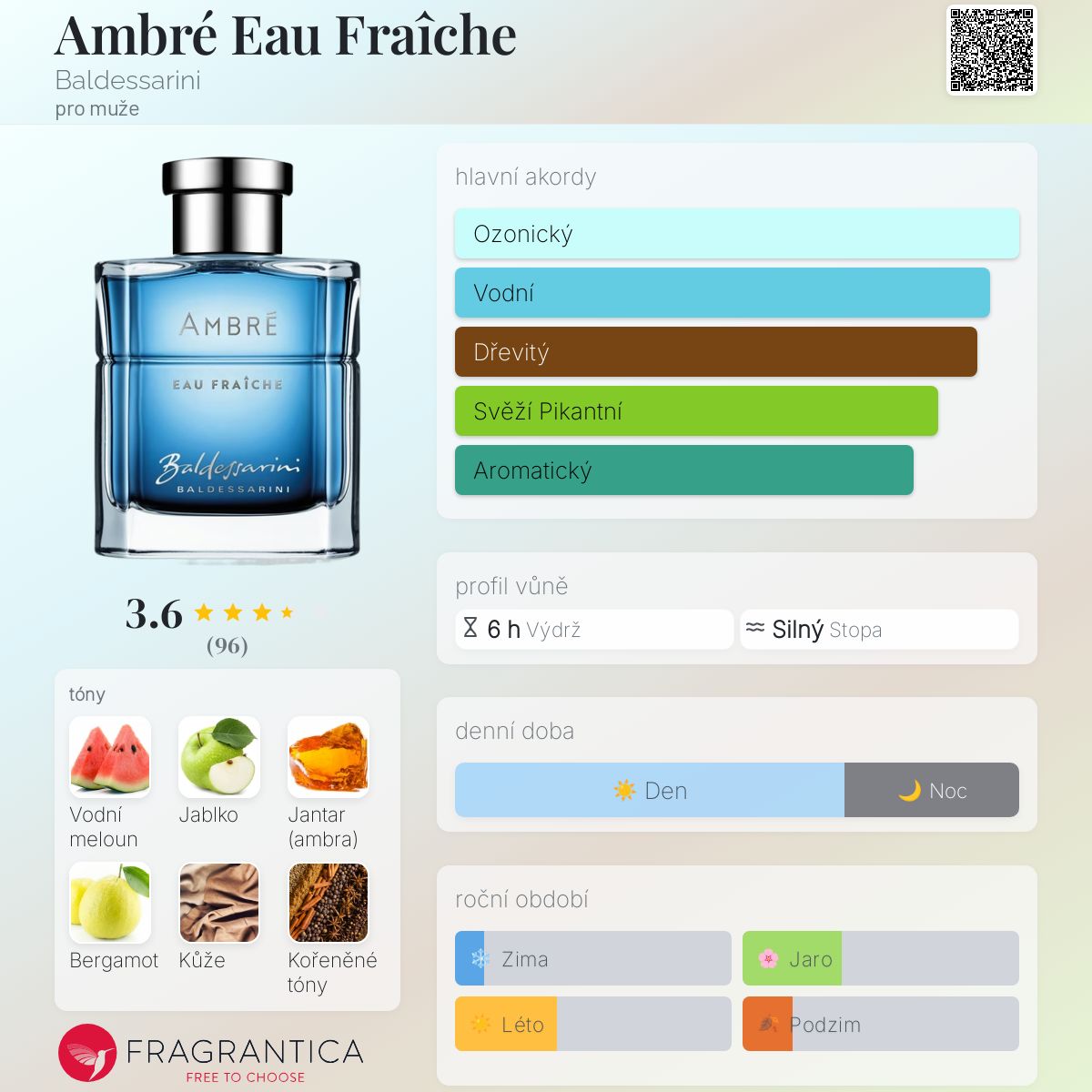 Ambré Eau Fraîche podle Baldessarini je Woody Aromatic vůně pro muže. Ambré Eau Fraîche byl/a uveden/a v roce 2020. Vrchní tóny jsou Vodní meloun, Bergamot a Aromatické koření; střední tóny jsouJablko, Fialkový list, Muškátový oříšek, Šalvěj a Cypřiš ; základní tóny jsou Jantar (ambra), Kůže, Dub a Santalové dřevo.