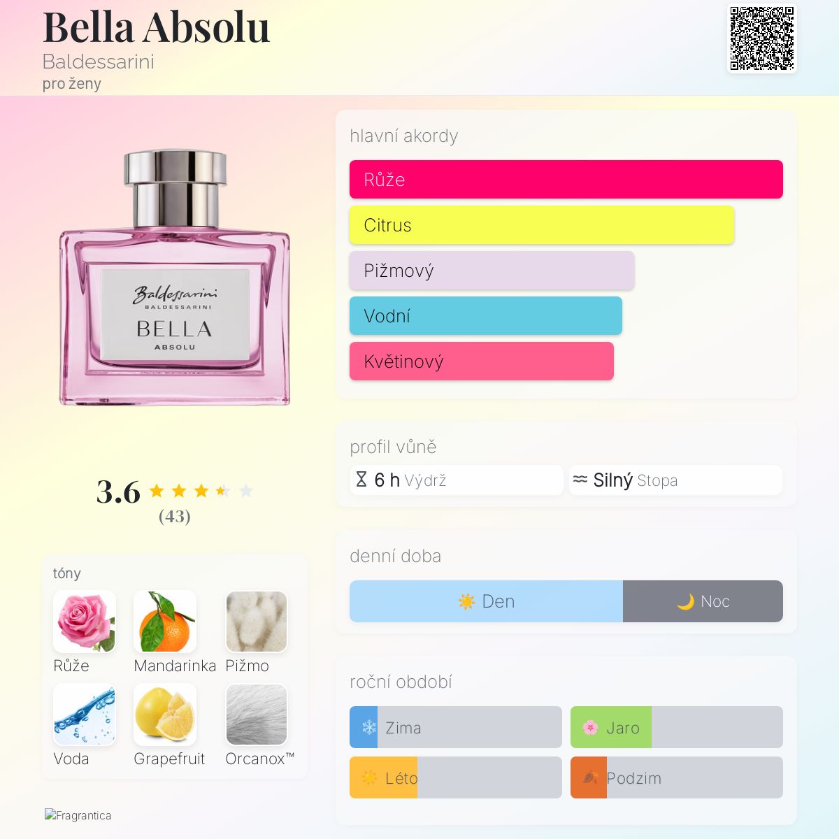 Bella Absolu podle Baldessarini je Floral Fruity vůně pro ženy. Bella Absolu byl/a uveden/a v roce 2023. Vrchní tóny jsou Žlutá mandarinka, Růžový grapefruit, Černý rybíz a Měsíček; střední tóny jsouRůže a Gardénie ; základní tóny jsou Pižmo, Vodnaté tóny a Orcanox™.