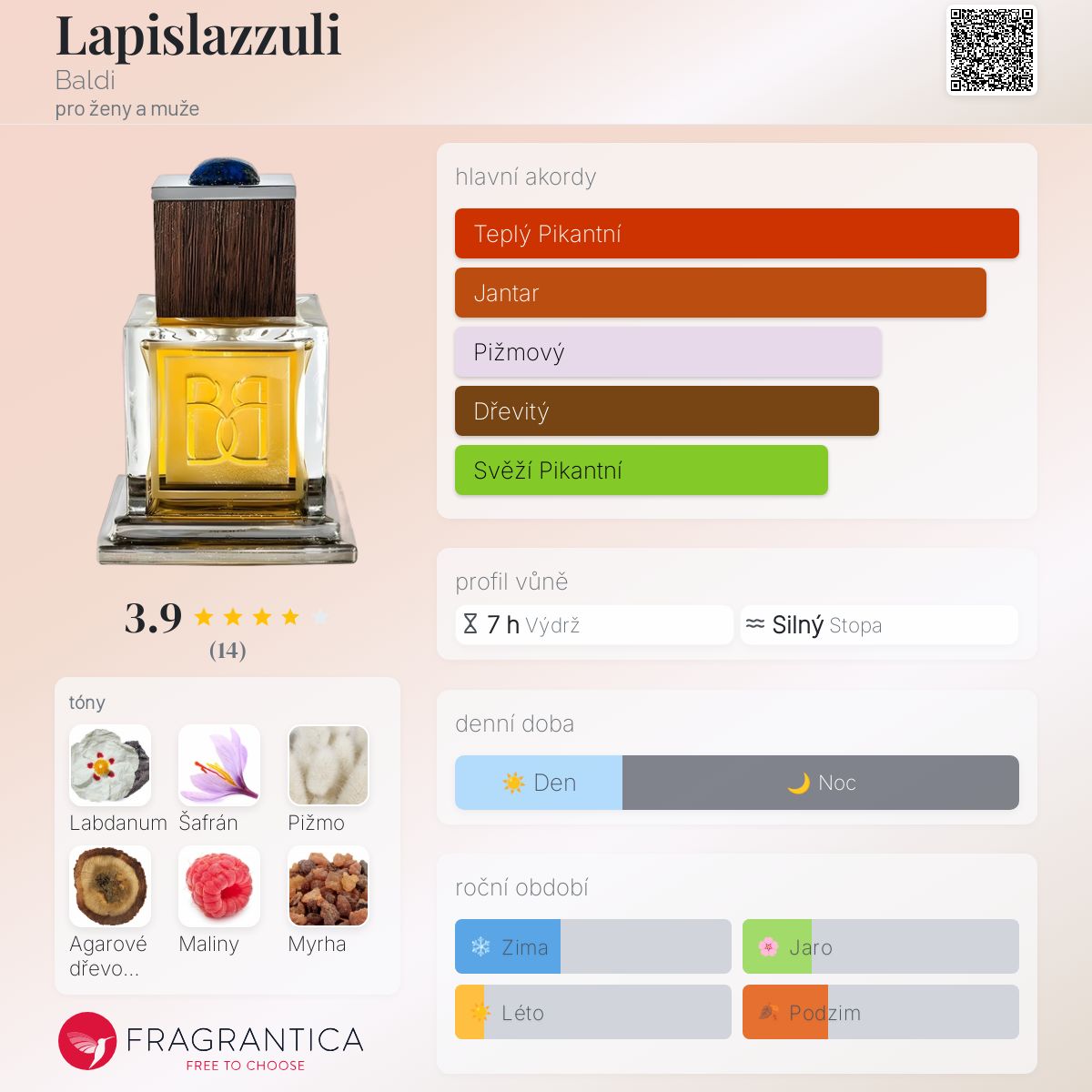 Lapislazzuli podle Baldi je Woody Spicy vůně pro ženy a muže. Lapislazzuli byl/a uveden/a v roce 2013. "Nosem" za touto vůní je Enzo Galardi. Vrchní tóny jsou Šafrán, Citrón, Černý pepř, Bergamot, Mandarinka a Broskev; střední tóny jsouLabdanum, Maliny, Myrha, Hřebíček, Jasmín, Pelargónie a Cedrové jehly ; základní tóny jsou Labdanum, Pižmo, Agarové dřevo (oud), Santalové dřevo, Pačuli, Ambra, Guajakové dřevo a Cedr.