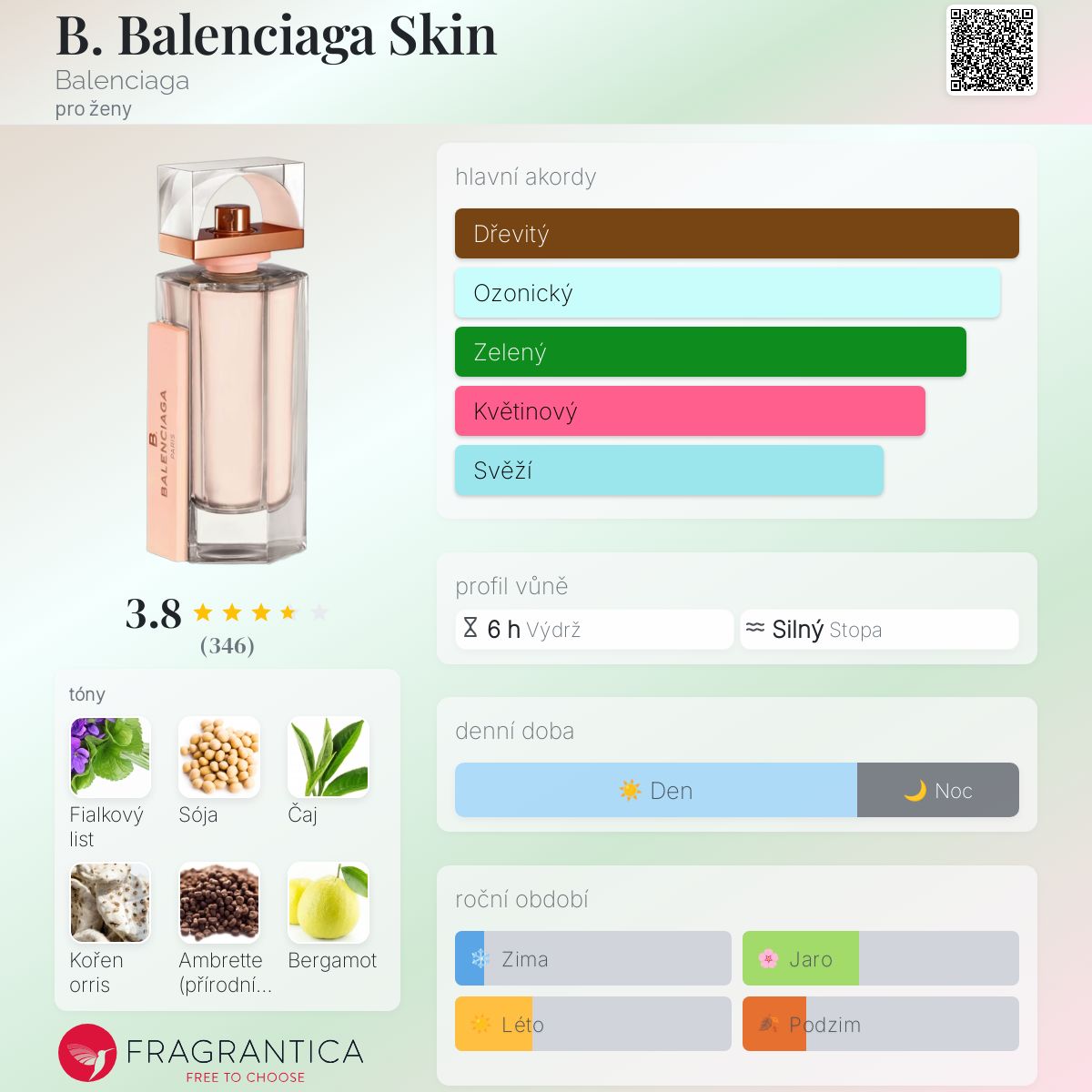 B. Balenciaga Skin podle Balenciaga je Floral Woody Musk vůně pro ženy. B. Balenciaga Skin byl/a uveden/a v roce 2015. "Nosem" za touto vůní je Domitille Michalon Bertier. Vrchní tóny jsou Sója, Zelený čaj, Bergamot a Konvalinka; střední tóny jsouFialkový list, Kořen kosatce a Pivoňka ; základní tóny jsou Ambrette (přírodní pižmo), Cedr, Vetiver a Kašmírové dřevo.