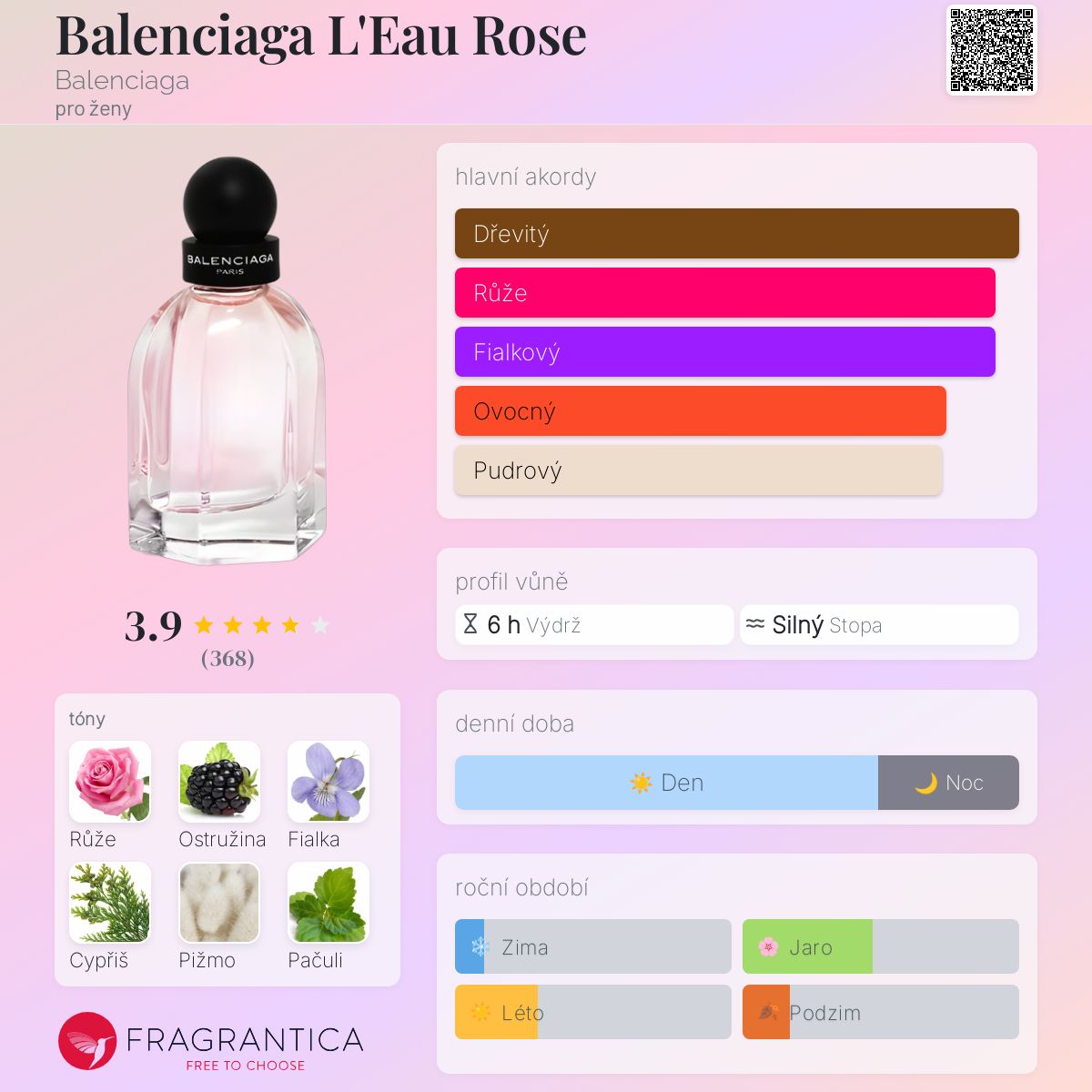 Balenciaga L'Eau Rose podle Balenciaga je Chypre Floral vůně pro ženy. Balenciaga L'Eau Rose byl/a uveden/a v roce 2013. Vrchní tón je Ostružina ; střední tóny jsouRůže, Fialka a Pačuli ; základní tóny jsou Cypřiš, Pižmo a Cedr.