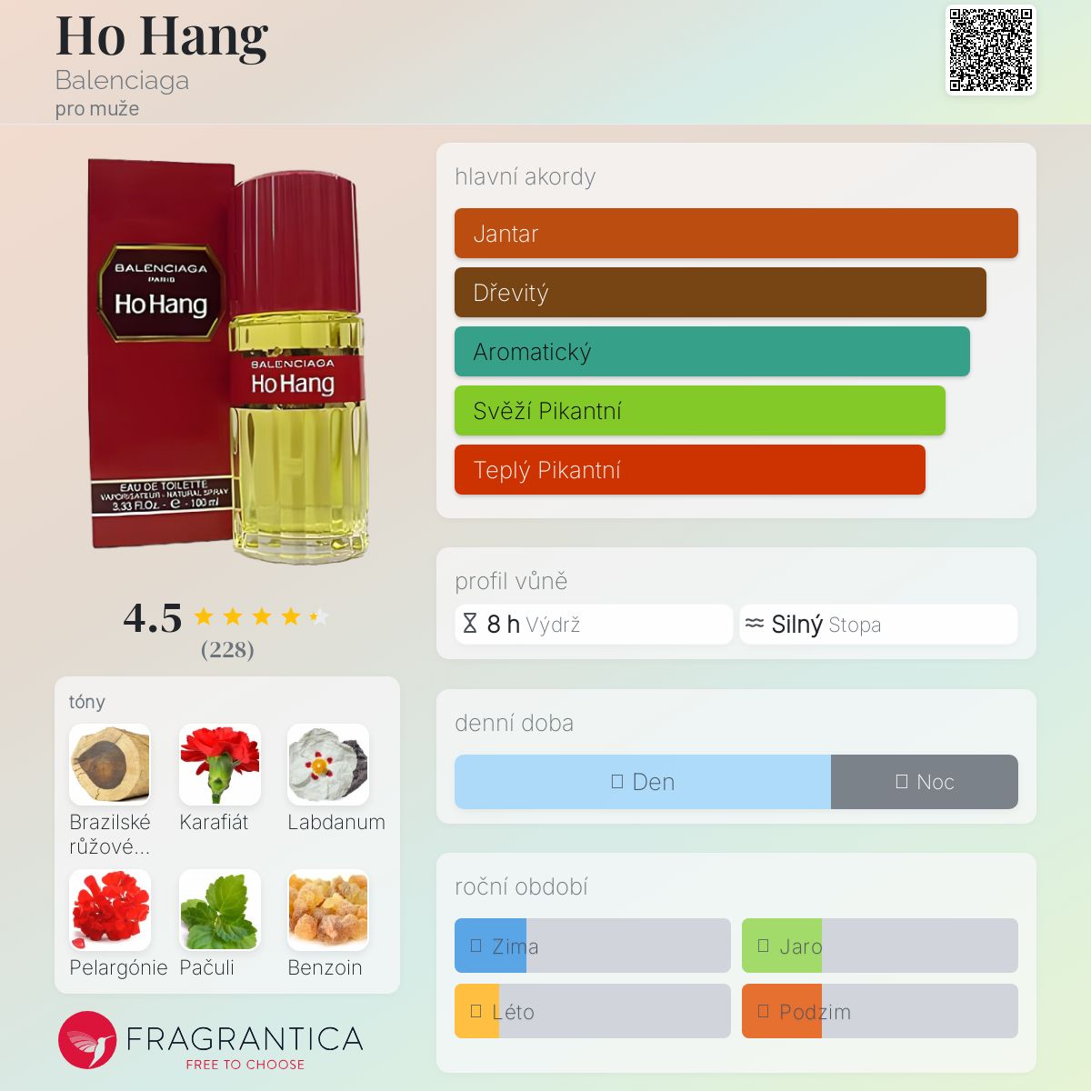 Ho Hang podle Balenciaga je Woody Spicy vůně pro muže. Ho Hang byl/a uveden/a v roce 1972. Ho Hang byl/a vytvořen/a Raymond Chaillan a Jacques Jantzen. Vrchní tóny jsou Levandule, Bergamot, Bazalka, Pomeranč a Citrón; střední tóny jsouBrazilské růžové dřevo, Karafiát, Pelargónie, Pačuli a Cedr ; základní tóny jsou Labdanum, Benzoin, Vanilka, Fazole tonka, Jantar (ambra) a Pižmo.