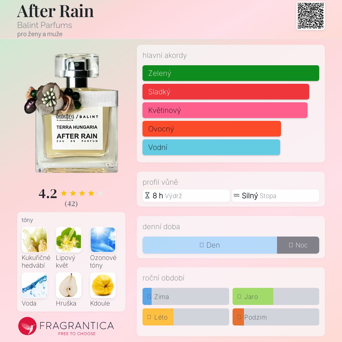 After Rain podle Balint Parfums je Floral Green vůně pro ženy a muže. After Rain byl/a uveden/a v roce 2019. "Nosem" za touto vůní je Csaba Balint. Vrchní tóny jsou Ozonové tóny, Vodní tóny, Hruška, Kdoule, Jetel, Rajčatový list, Bergamot a Citrón; střední tóny jsouKukuřičné hedvábí, Lipový květ, Trnka, Heřmánek, Pšenice, Zlatobýl, Leknín, Fialka a Květ hedvábného dřeva ; základní tóny jsou Seno, Zemité tóny, Vanilka, Bílé pižmo, Santalové dřevo a Labdanum.