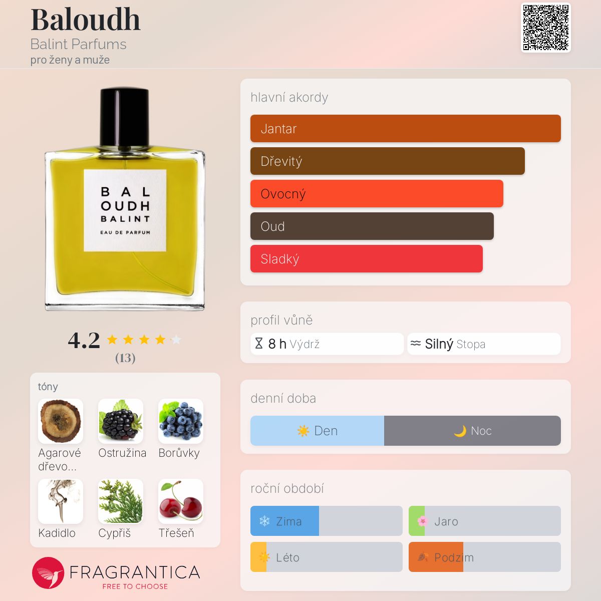 Baloudh podle Balint Parfums je Orientální Floral vůně pro ženy a muže. "Nosem" za touto vůní je Csaba Balint. Vrchní tóny jsou Ostružina, Borůvky, Třešeň, Smrk a Kalábrijský bergamot; střední tóny jsouAgarové dřevo (oud), Kadidlo, Cypřiš, Březová smola, Toskánský kosatec, Tuberóza a Bulharská růže ; základní tóny jsou Kůže, Jantar (ambra), Labdanum, Opoponax, Seno, Santalové dřevo, Vanilka, Pižmo a Pačuli.