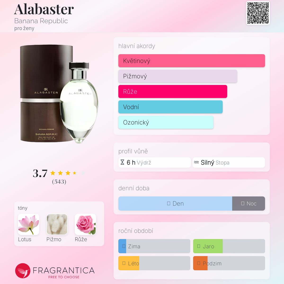 Alabaster podle Banana Republic je Floral Woody Musk vůně pro ženy. Alabaster byl/a uveden/a v roce 2006. "Nosem" za touto vůní je Honorine Blanc. Vrchní tón je Lotus ; střední tón jeRůže ; základní tón je Pižmo.