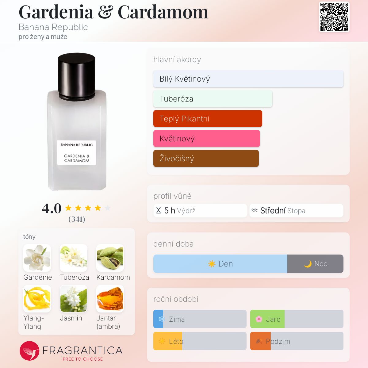 Gardenia & Cardamom podle Banana Republic je Floral vůně pro ženy a muže. Gardenia & Cardamom byl/a uveden/a v roce 2019. Gardenia & Cardamom byl/a vytvořen/a Mane a Vincent Kuczinski. Vrchní tóny jsou Gardénie a Mandarinka; střední tóny jsouTuberóza, Kardamom, Ylang-Ylang, Jasmín, Magnólie, Karafiát a Růže ; základní tóny jsou Jantar (ambra) a Naplavené dříví.