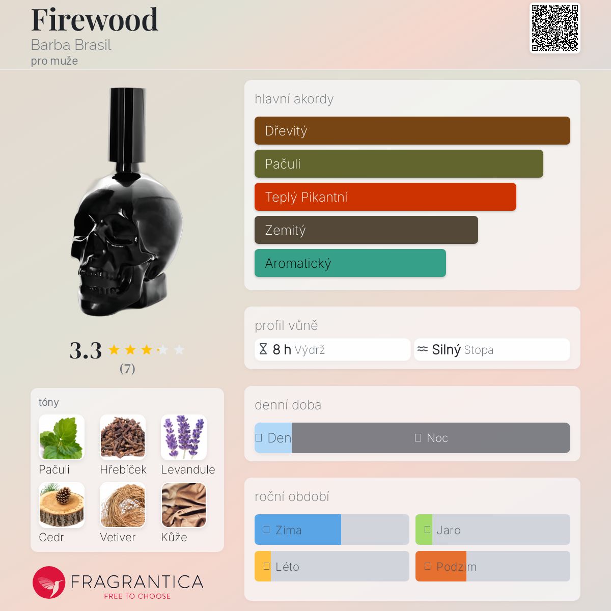 Firewood podle Barba Brasil je Leather vůně pro muže. Firewood byl/a uveden/a v roce 2020. Vrchní tóny jsou Hřebíček a Levandule; střední tóny jsouCedr a Vetiver ; základní tóny jsou Pačuli a Kůže.