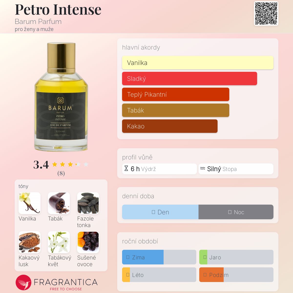 Petro Intense podle Barum Parfum je Woody Aromatic vůně pro ženy a muže. Petro Intense byl/a uveden/a v roce 2022. Petro Intense byl/a vytvořen/a Grazia Consiglio, Gianluca Baudo a Michele Carnevale. Vrchní tóny jsou Tabákový list a Koření; střední tóny jsouVanilka, Fazole tonka, Kakao a Tabákový květ ; základní tóny jsou Sušené ovoce a Dřevité tóny.