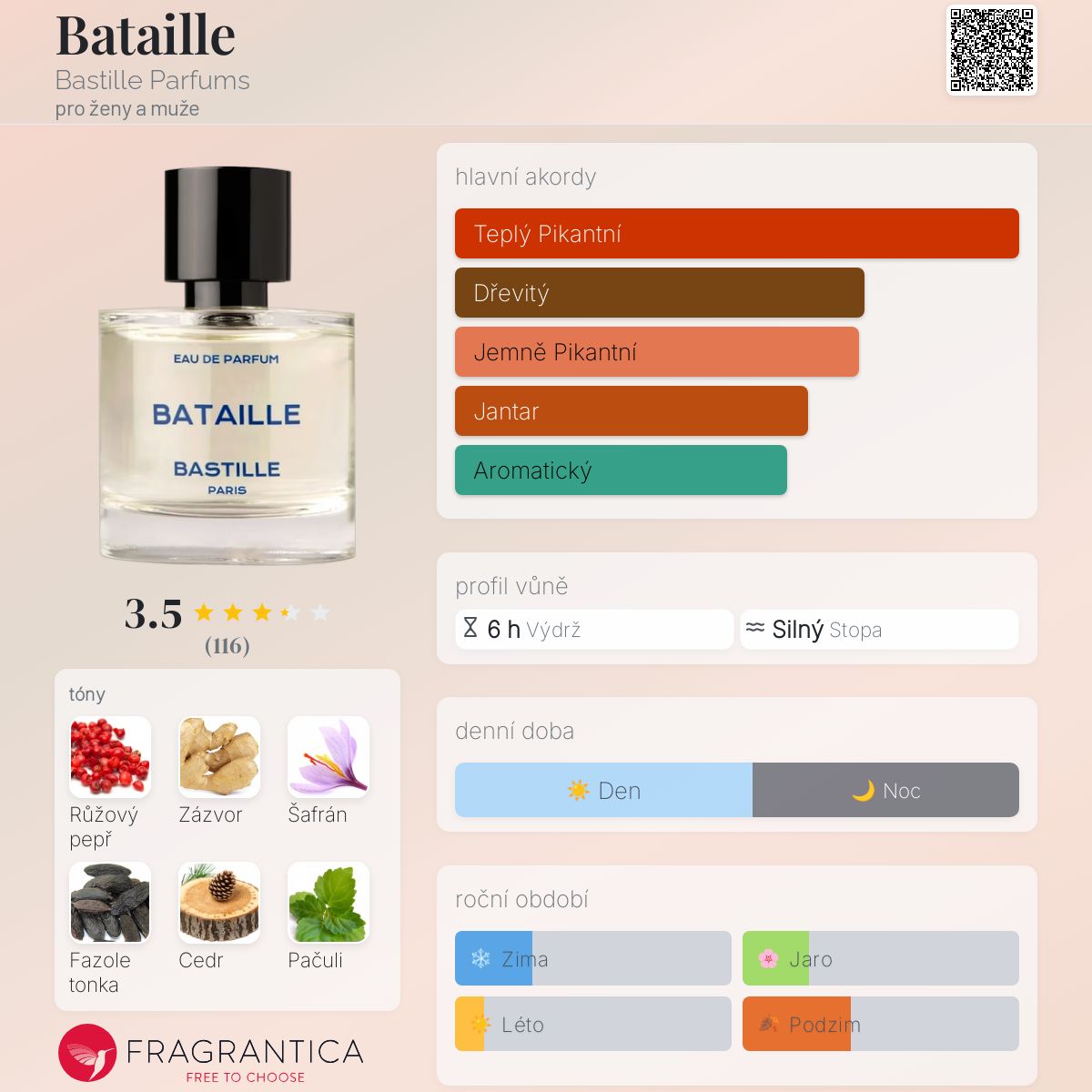 Bataille podle Bastille Parfums je vůně pro ženy a muže. Bataille byl/a uveden/a v roce 2020. "Nosem" za touto vůní je Nicolas Beaulieu. Vrchní tóny jsou Růžový pepř, Zázvor, Šafrán a Magnólie; střední tóny jsouVirginský cedr a Šalvěj ; základní tóny jsou Fazole tonka, Pačuli a Amber Xtreme.