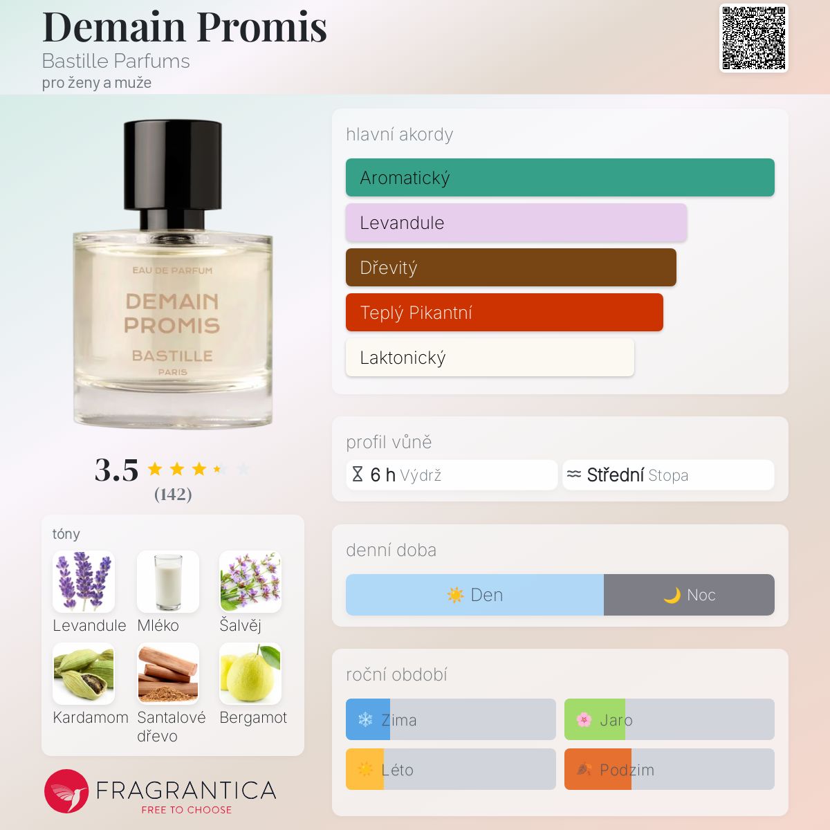 Demain Promis podle Bastille Parfums je vůně pro ženy a muže. Demain Promis byl/a uveden/a v roce 2020. "Nosem" za touto vůní je Caroline Dumur. Vrchní tóny jsou Kardamom, Bergamot a Skořice; střední tóny jsouLevandule, Mléko, Šalvěj a Růže ; základní tóny jsou Santalové dřevo, Vetiver, Kašmír, Fazole tonka a Pačuli.
