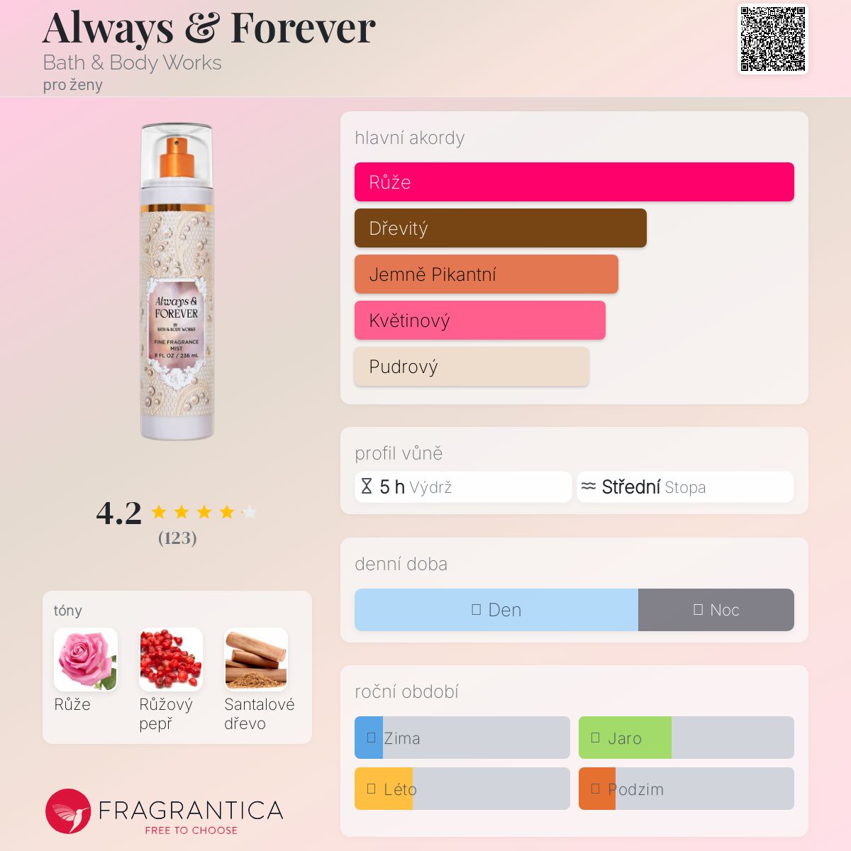 Always & Forever podle Bath & Body Works je Floral Woody Musk vůně pro ženy. Toto je nová vůně. Always & Forever byl/a uveden/a v roce 2025.