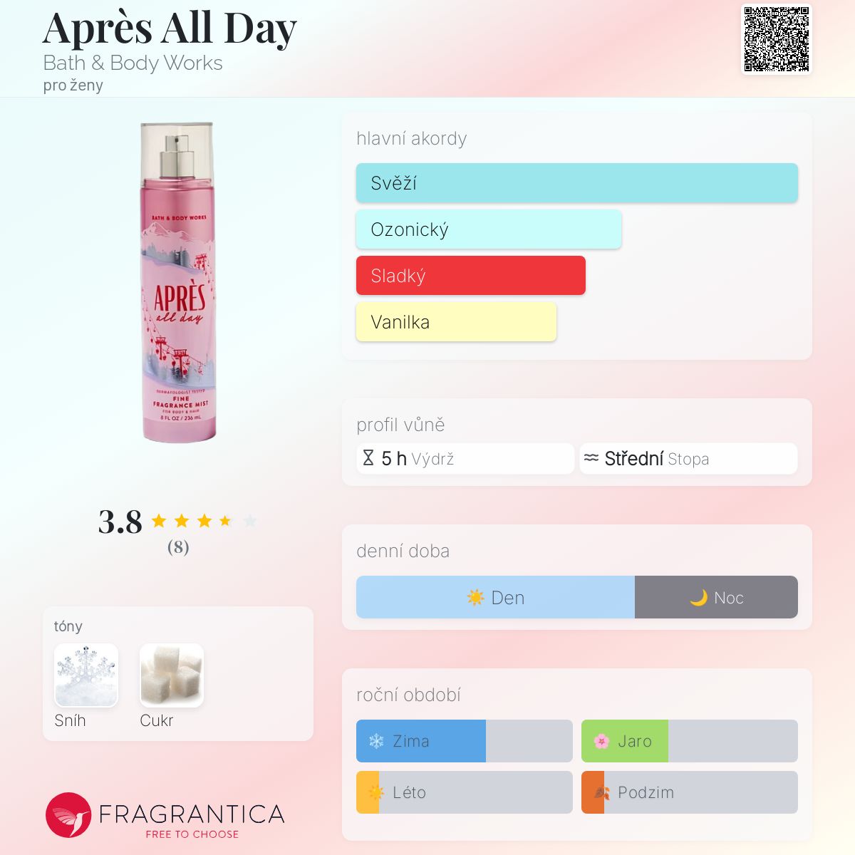 Après All Day podle Bath & Body Works je Floral Woody Musk vůně pro ženy. Toto je nová vůně. Après All Day byl/a uveden/a v roce 2025.