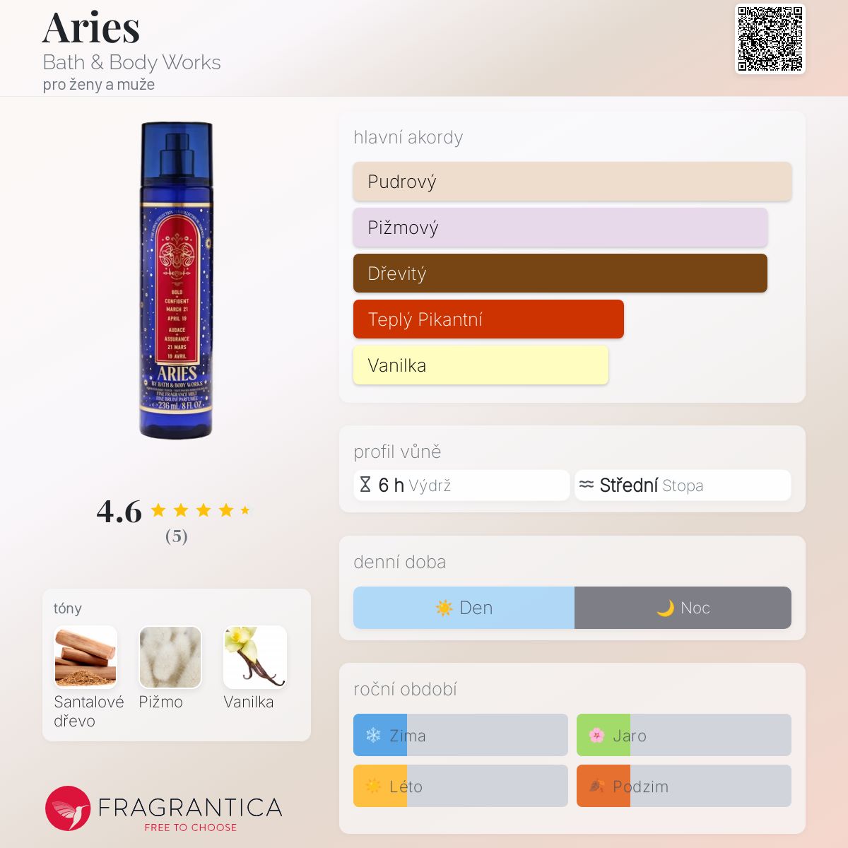 Aries podle Bath & Body Works je Orientální Woody vůně pro ženy a muže. Toto je nová vůně. Aries byl/a uveden/a v roce 2025.