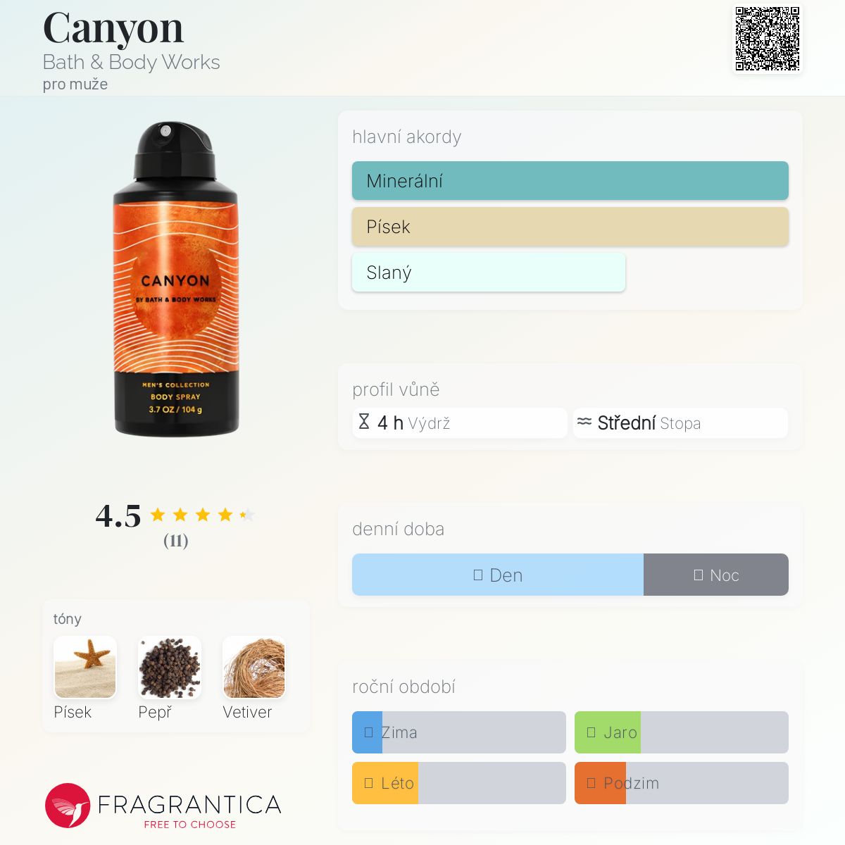 Canyon podle Bath & Body Works je Orientální Spicy vůně pro muže. Toto je nová vůně. Canyon byl/a uveden/a v roce 2024.
