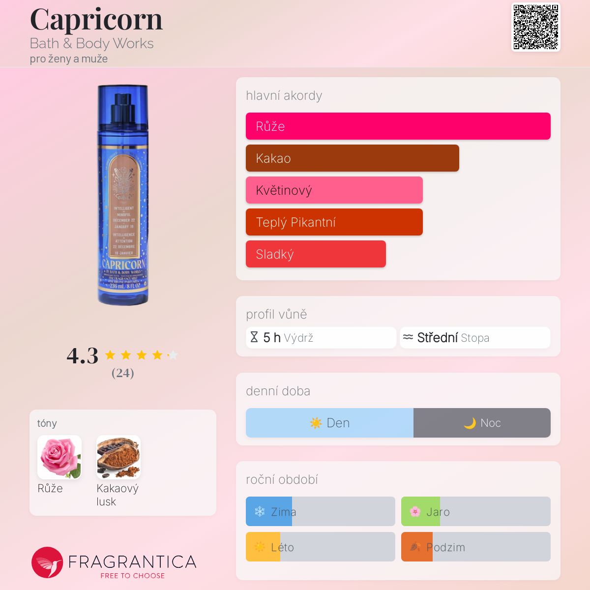 Capricorn podle Bath & Body Works je Floral vůně pro ženy a muže. Toto je nová vůně. Capricorn byl/a uveden/a v roce 2025. Vrchní tón je Okvětní lístky růží ; střední tón jeKakao ;
