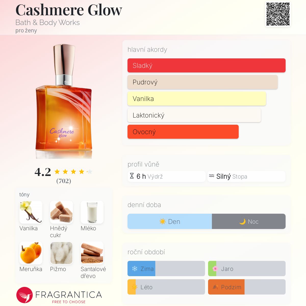 Cashmere Glow podle Bath & Body Works je Floral Fruity Gourmand vůně pro ženy. Cashmere Glow byl/a uveden/a v roce 2012. Vrchní tóny jsou Meruňka, Guava, Lesní plody a Bergamot; střední tóny jsouJasmín, Mimóza, Pivoňka a Konvalinka ; základní tóny jsou Vanilka, Hnědý cukr, Mléko, Kašmírové pižmo a Santalové dřevo.