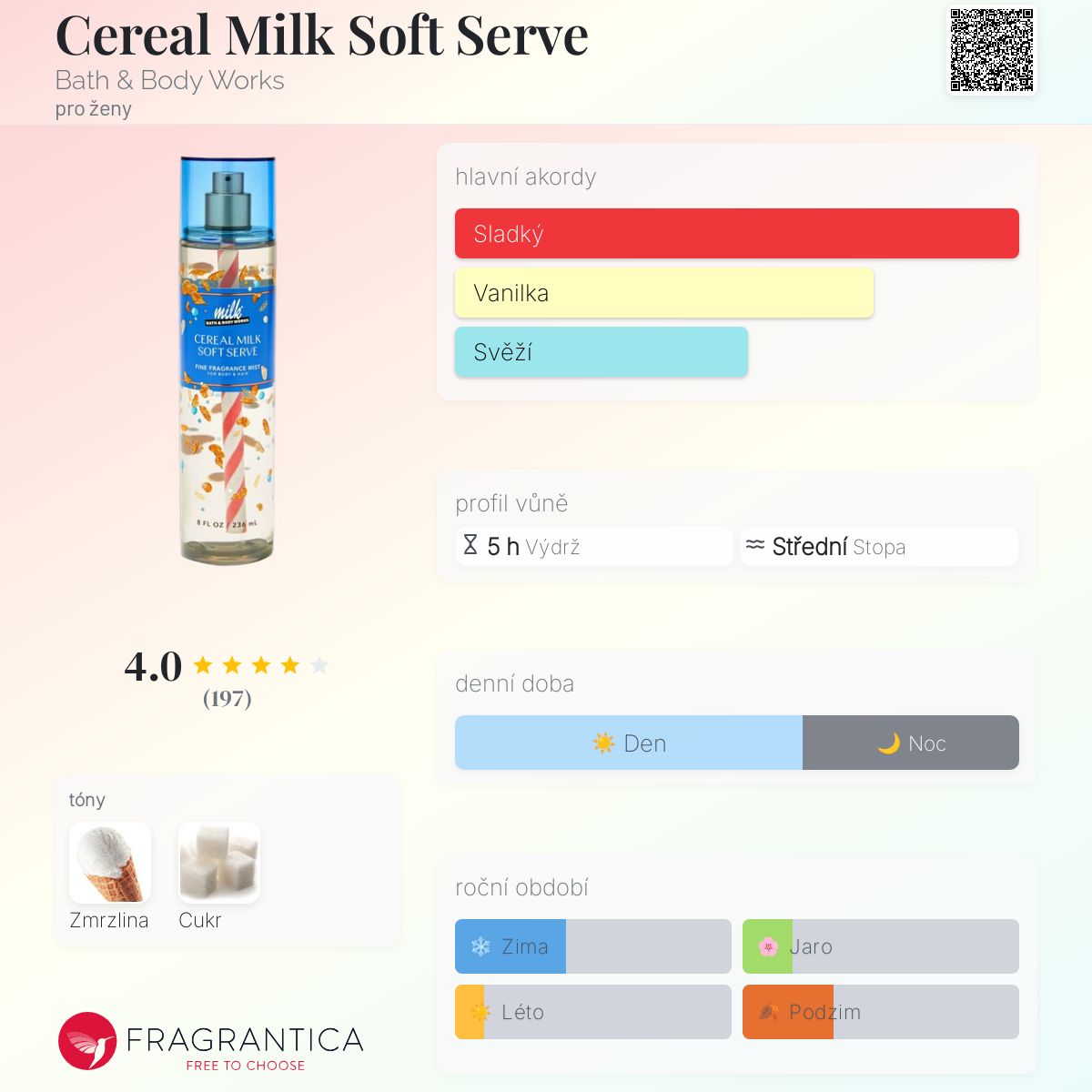 Cereal Milk Soft Serve podle Bath & Body Works je Floral Fruity Gourmand vůně pro ženy. Toto je nová vůně. Cereal Milk Soft Serve byl/a uveden/a v roce 2025. Vrchní tón je Zmrzlina ; základní tón je Cukr.