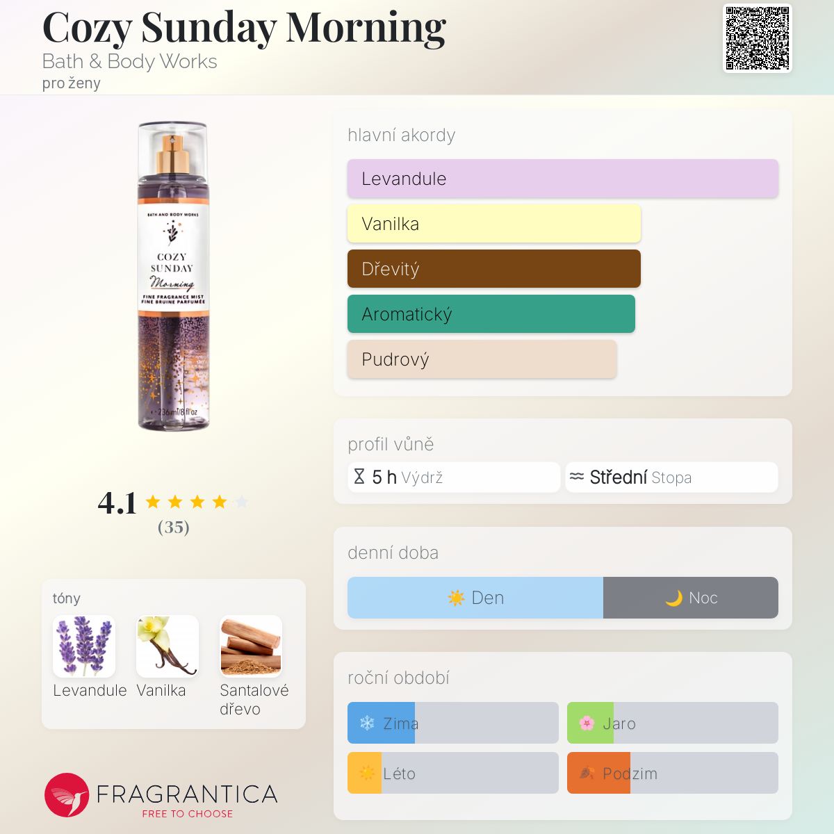 Cozy Sunday Morning podle Bath & Body Works je Woody Aromatic vůně pro ženy. Cozy Sunday Morning byl/a uveden/a v roce 2015.