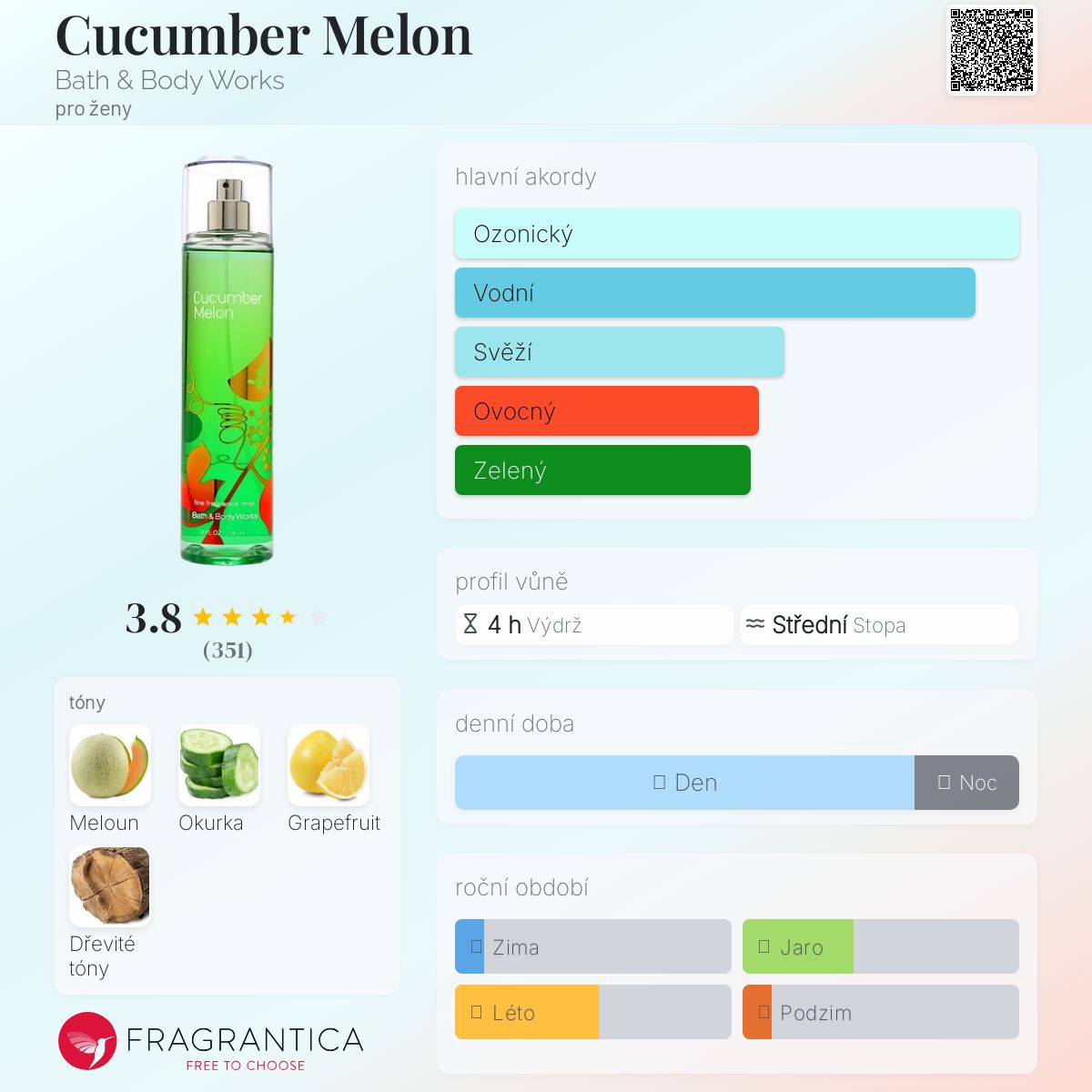 Cucumber Melon podle Bath & Body Works je Aromatic Fruity vůně pro ženy. Cucumber Melon byl/a uveden/a v roce 2019.