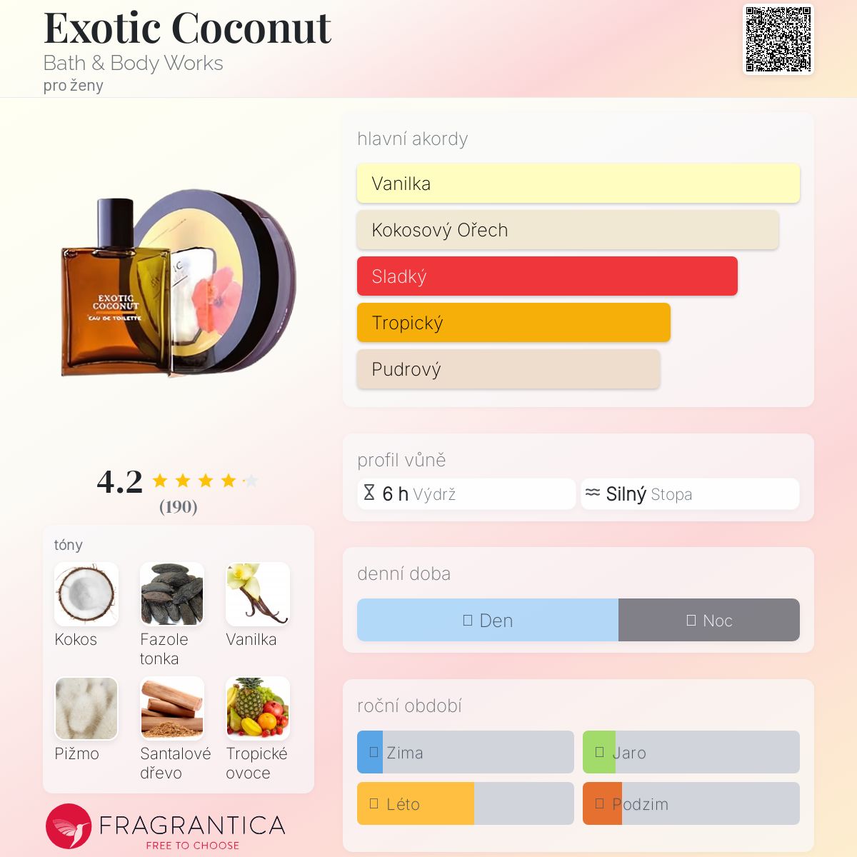 Exotic Coconut podle Bath & Body Works je Orientální vůně pro ženy. Vrchní tóny jsou Tropické ovoce a Červené bobule; střední tóny jsouKokosové mléko a Vanilkový lusk ; základní tóny jsou Fazole tonka, Pižmo a Santalové dřevo.