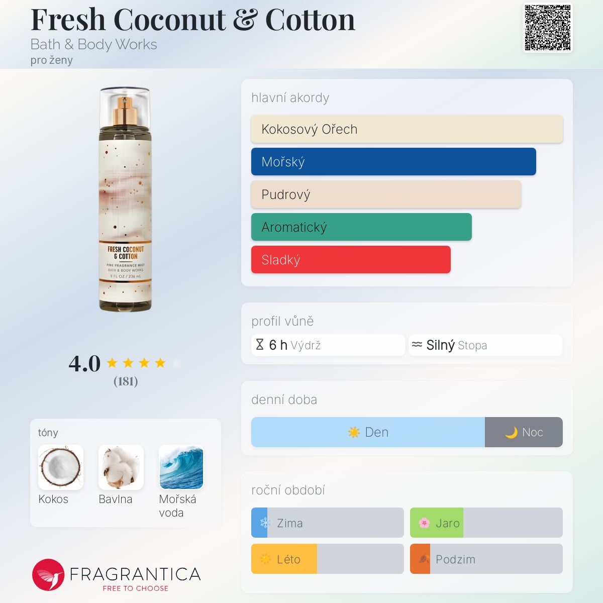 Fresh Coconut & Cotton podle Bath & Body Works je Aromatic vůně pro ženy. Fresh Coconut & Cotton byl/a uveden/a v roce 2022.