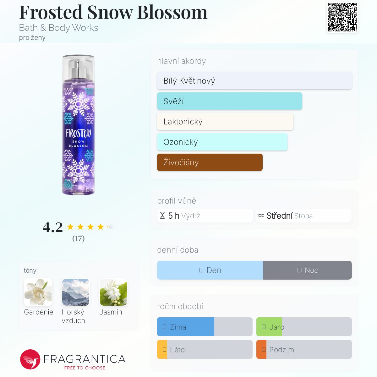 Frosted Snow Blossom podle Bath & Body Works je Floral vůně pro ženy. Frosted Snow Blossom byl/a uveden/a v roce 2019.