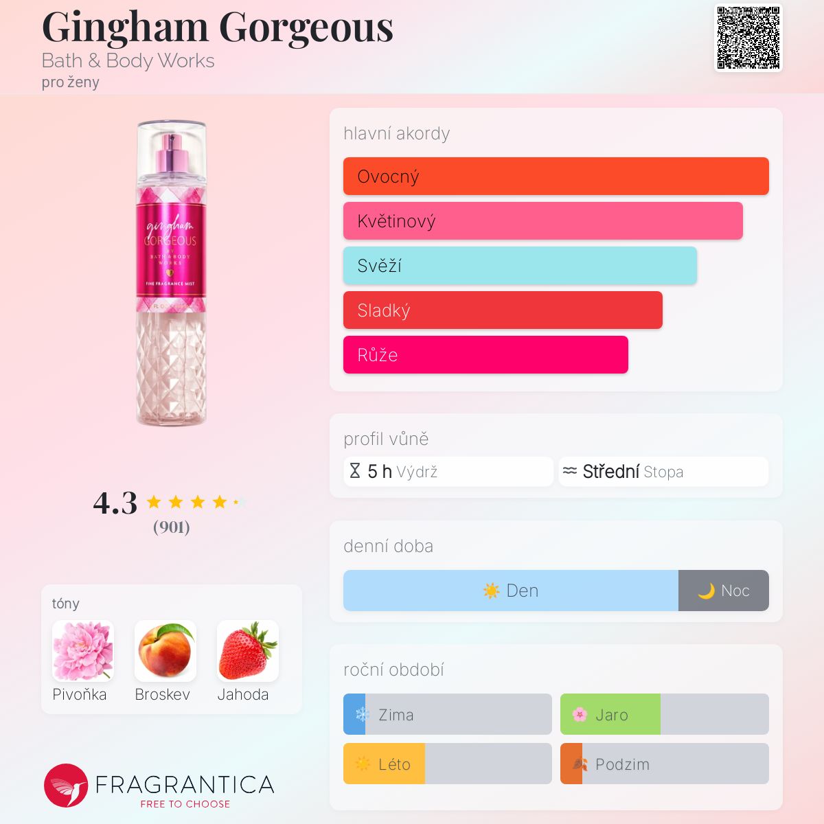 Gingham Gorgeous podle Bath & Body Works je Floral Fruity vůně pro ženy. Gingham Gorgeous byl/a uveden/a v roce 2023. "Nosem" za touto vůní je Vincent Kuczinski.