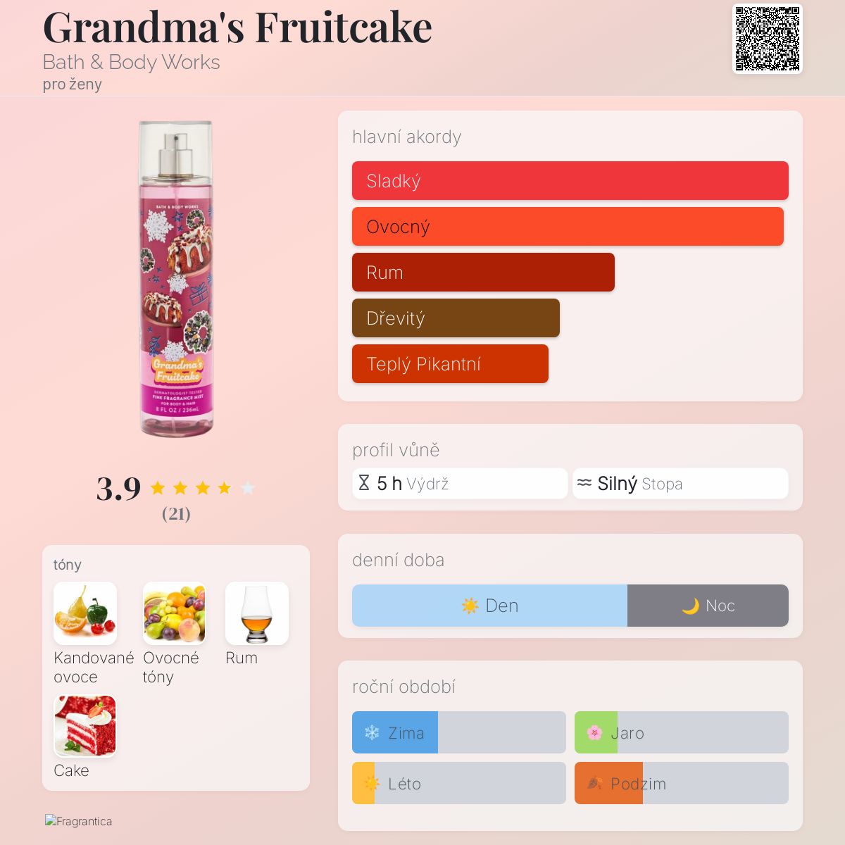 Grandma's Fruitcake podle Bath & Body Works je Orientální Vanilla vůně pro ženy. Toto je nová vůně. Grandma's Fruitcake byl/a uveden/a v roce 2025.