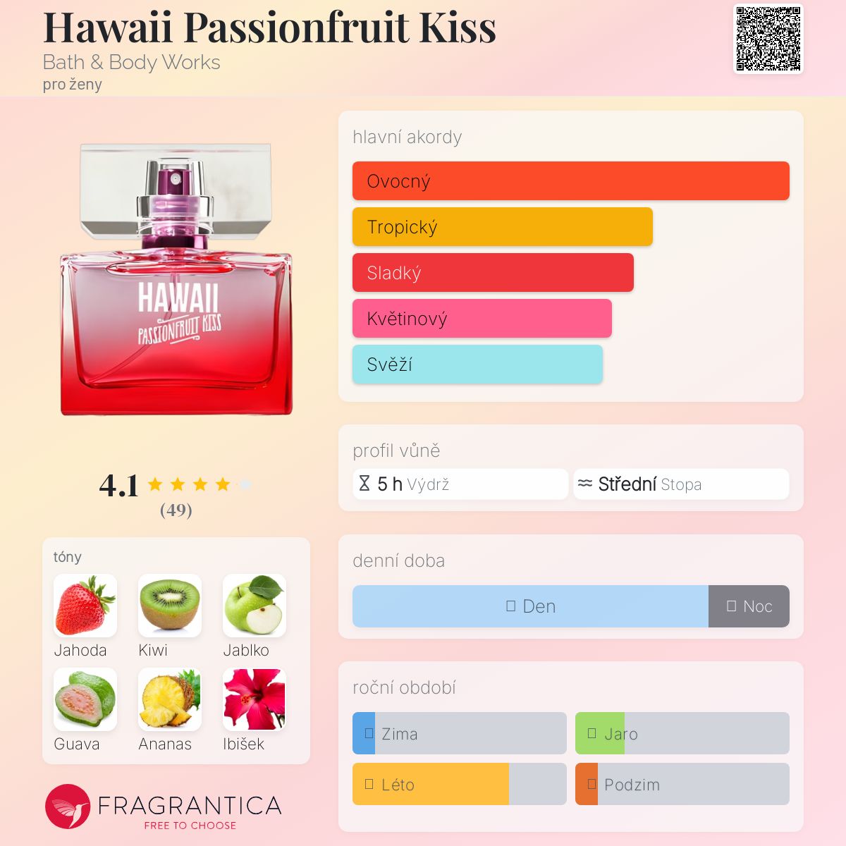 Hawaii Passionfruit Kiss podle Bath & Body Works je Floral Fruity vůně pro ženy. Hawaii Passionfruit Kiss byl/a uveden/a v roce 2015. Vrchní tóny jsou Velká jahoda, Kiwi, Jablko a Guava; střední tóny jsouAnanas, Ibišek, Strelície a Květ papáji ; základní tóny jsou Mořské tóny, Makadamie, Mořská sůl a Pižmo.