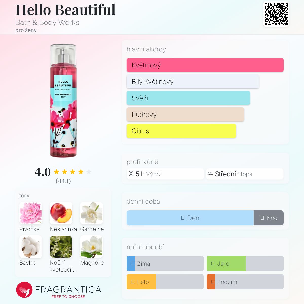 Hello Beautiful podle Bath & Body Works je Floral vůně pro ženy. Hello Beautiful byl/a uveden/a v roce 2016. Vrchní tóny jsou Nektarinka, Italská mandarinka a Pomelo; střední tóny jsouRůžová pivoňka, Gardénie, Noční kvetoucí jasmín a Magnólie ; základní tóny jsou Bavlna, Pižmo, Bílý jantar (ambra) a Naplavené dříví.