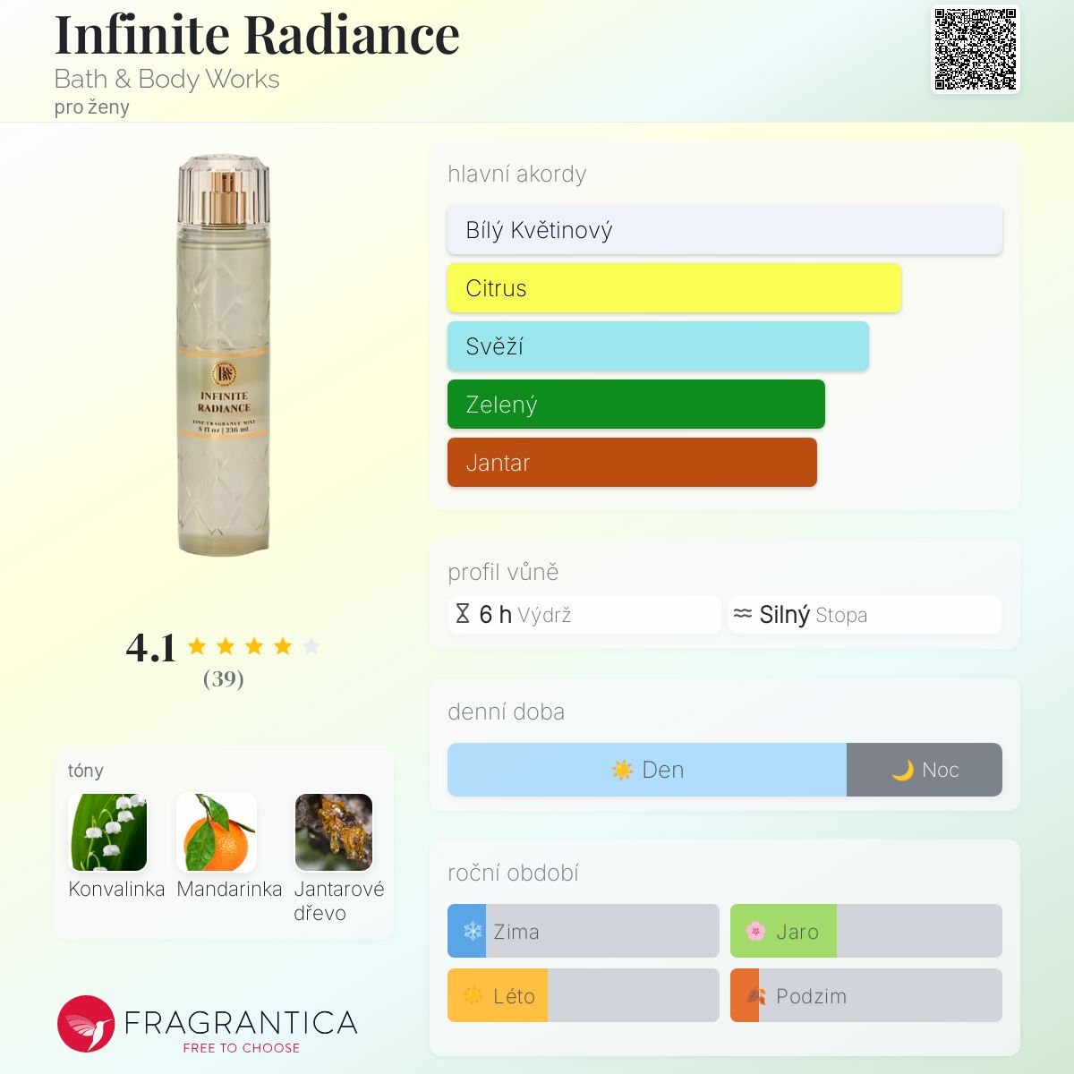 Infinite Radiance podle Bath & Body Works je Woody Floral Musk vůně pro ženy. Toto je nová vůně. Infinite Radiance byl/a uveden/a v roce 2025.