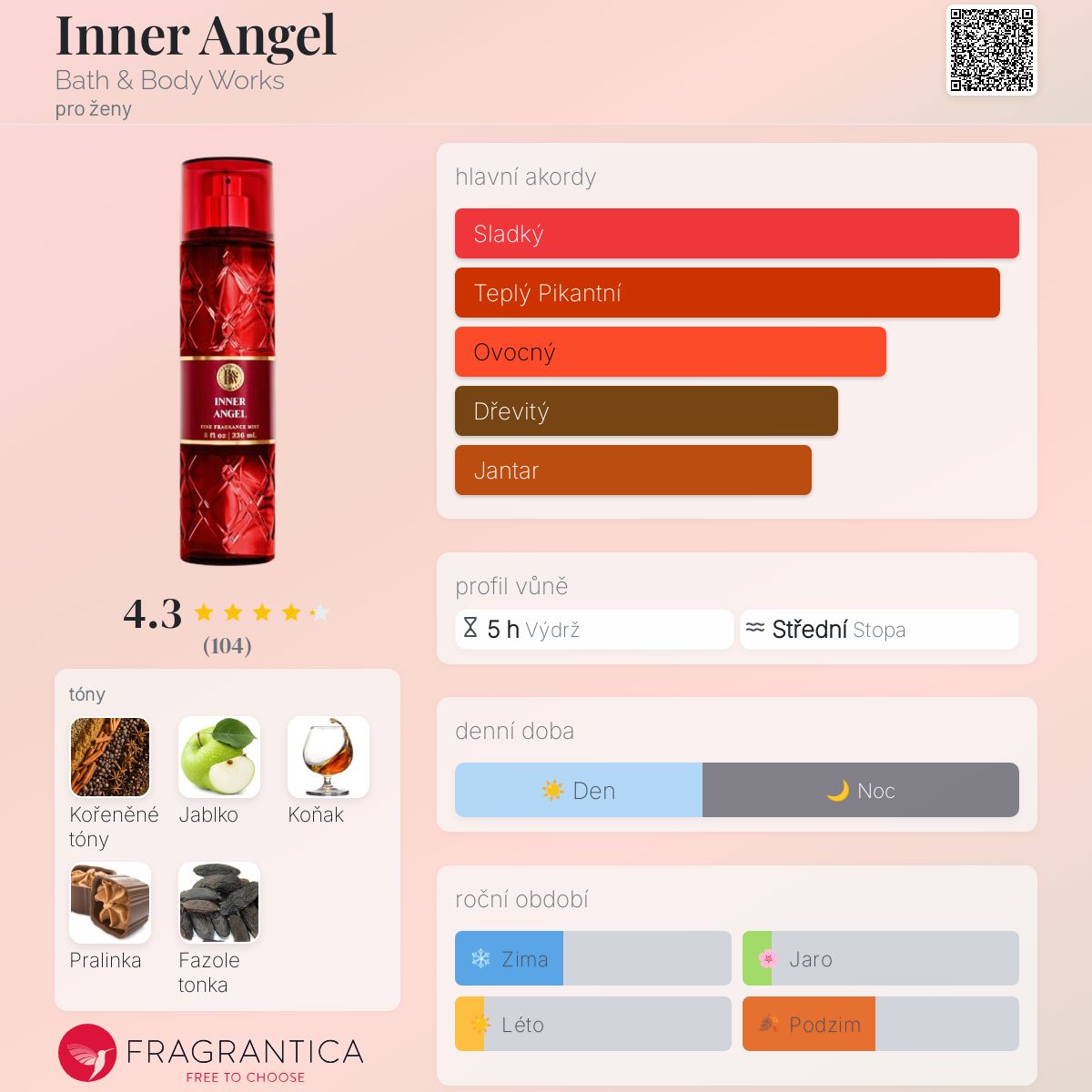 Inner Angel podle Bath & Body Works je Orientální Vanilla vůně pro ženy. Toto je nová vůně. Inner Angel byl/a uveden/a v roce 2025. Vrchní tóny jsou Jablko, Koření a Koňak; střední tón jeFazole tonka ; základní tón je Pralinka.