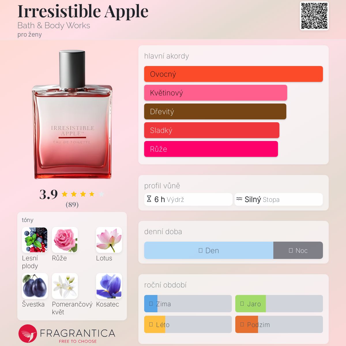 Irresistible Apple podle Bath & Body Works je Floral Fruity vůně pro ženy. Irresistible Apple byl/a uveden/a v roce 2007. Vrchní tóny jsou Lesní plody, Švestka a Bergamot; střední tóny jsouBílá růže, Lotosové lístky, Pomerančový květ a Kosatec ; základní tóny jsou Pižmo, Pralinka, Santalové dřevo, Pačuli, Jantar (ambra) a Vanilka.